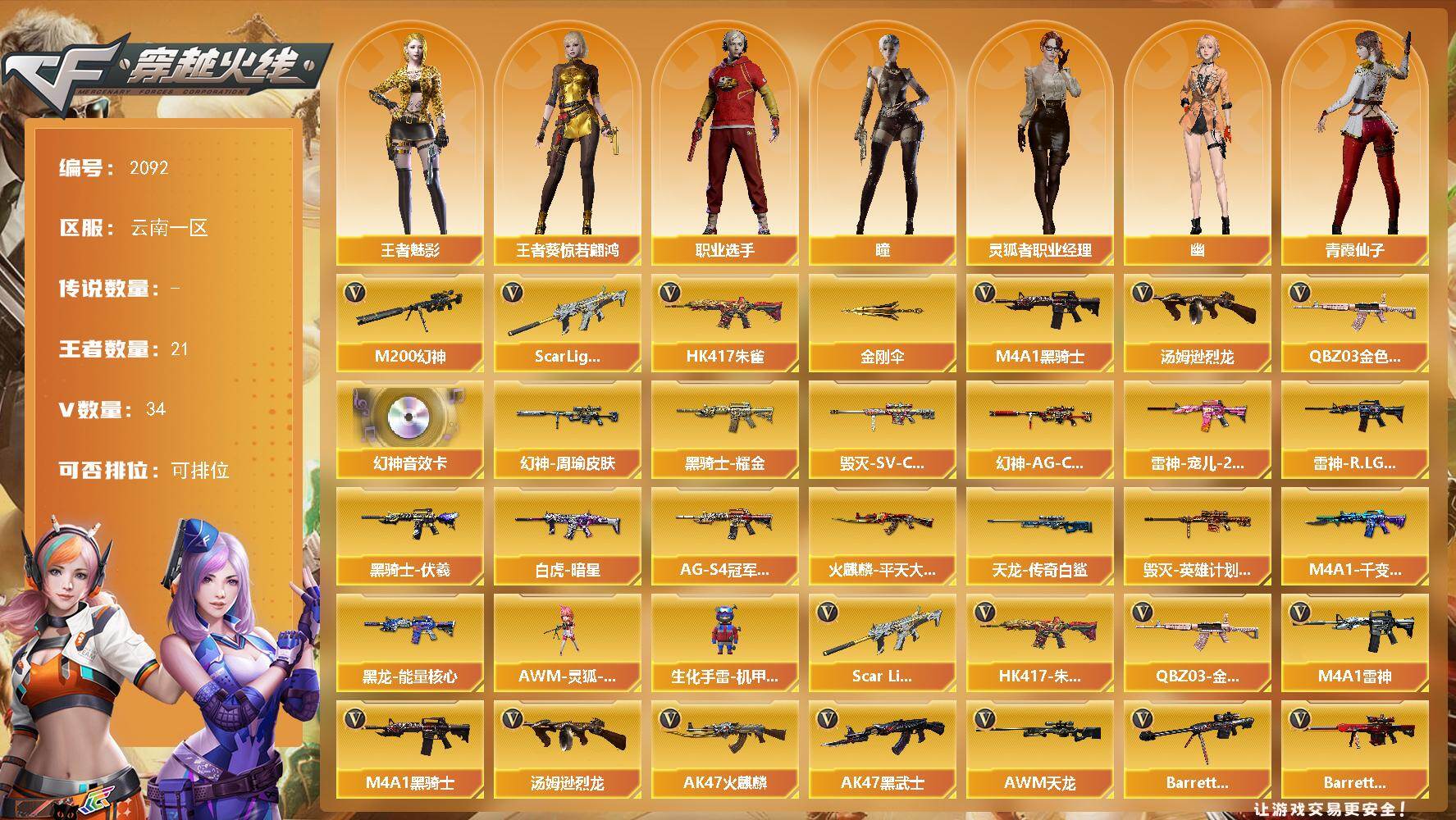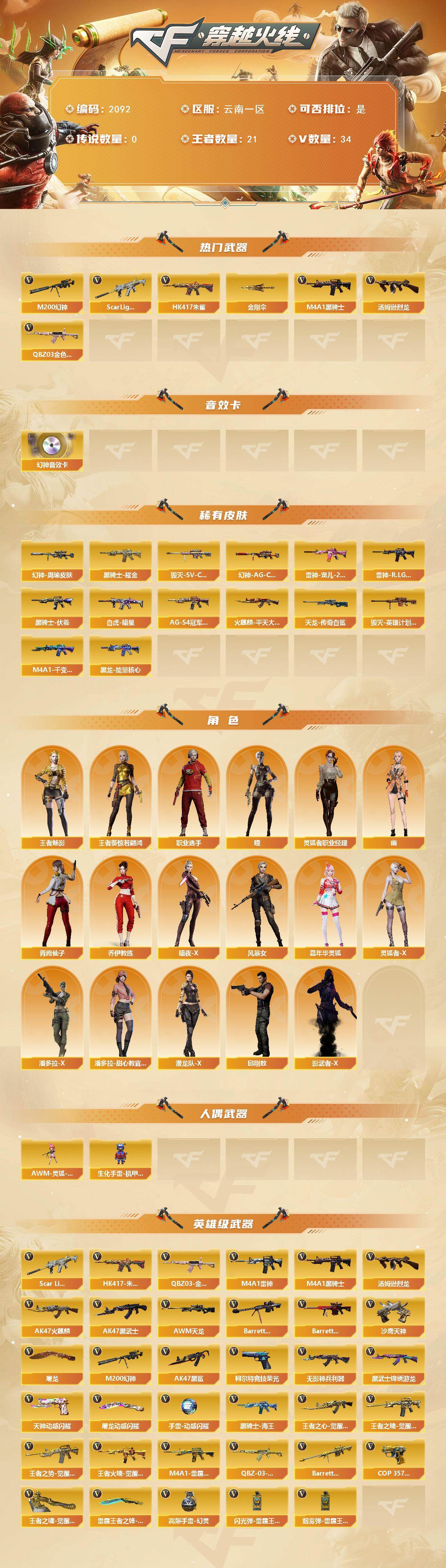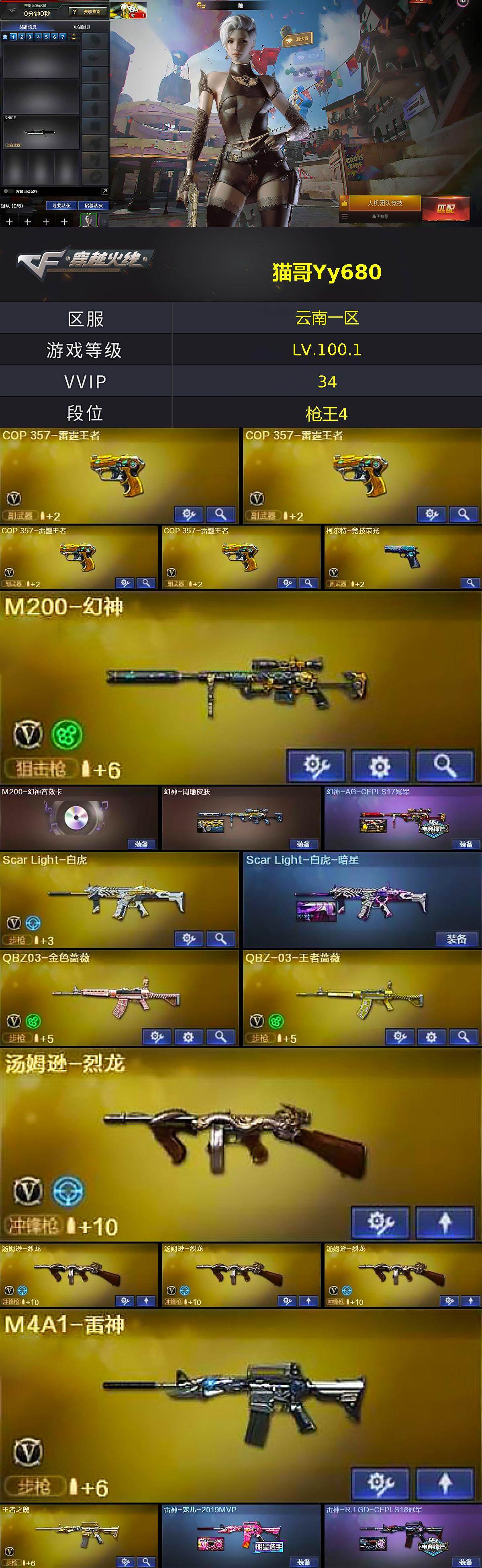 [16679978]云南一区-53V-21王者武器数-0炫金武器数 【热门武器】:QBZ03-金色蔷薇,Scar Light-白虎,HK417-朱雀,M200-幻神,M4A1-黑骑士,汤姆逊-烈龙*4,金刚伞 【音效卡】:M200-幻神音效卡 【皮肤】:幻神-周瑜皮肤,幻神-AG-CFPLS17冠军,Scar Light-白虎-暗星,雷神-宠儿-2019MVP,雷神-R.LGD-CFPLS18冠军,火麒麟-平天大圣,毁灭-SV-CFPLS16冠军,毁灭-英雄计划 皮肤,M4A1-千变-孔明皮肤,黑龙-能量核心,黑骑士耀金皮肤,黑骑士-伏羲,黑骑士-AG-S4冠军典藏,AWM-天龙-传奇白鲨 【角色】:瞳,王者葵-惊若翩鸿,王者-魅影,乔伊教练,暗夜-X,风暴女,嘉年华灵狐,灵狐者-X,灵狐者-职业经理,潘多拉-X,潘多拉-甜心教官,潜龙队-X,邱刚敖,青霞仙子,影武者-X,幽,职业选手 【人偶武器】:AWM-灵狐-15周年嘉年华,生化手雷-机甲核心 【英雄级武器】:AK47-火麒麟,M4A1-雷神,M4A1-黑骑士,AK47-黑武士,AK47-黑鲨,HK417-朱雀,Scar Light-白虎,无影-神兵利器,黑武士-锦绣游龙,QBZ03-金色蔷薇,王者之心-觉醒版,王者之魄-觉醒版,王者之势-觉醒版,王者火魄-觉醒版,黑骑士-海王,M4A1-雷霆王者-觉醒版,QBZ-03-王者蔷薇-觉醒版,AWM-天龙,Barrett-毁灭,Barrett-极光,M200-幻神,Barrett-雷霆王者-觉醒版,汤姆逊-烈龙*4,沙鹰-天神*6,COP 357-雷霆王者-觉醒版*4,柯尔特-竞技荣光,天神-动感闪耀,屠龙*2,屠龙-动感闪耀,王者之啸-觉醒版,雷霆王者之锋-觉醒版,高爆手雷-幻灵,手雷-动感闪耀,闪光弹-雷霆王者-觉醒版*2,烟雾弹-雷霆王者-觉醒版*3 【道具】:BS战队炫彩背包,女皇终结者-魔龙之吻,绿色巨人,灵魂忍者,迷雾幽灵,生化弹匣,夺命之镰,防化服*3,金色流光-枪王排位*2,星辰流光-枪王排位,枪王排位28赛季金色流光,C4-红龙,防弹头盔*6,防弹衣*6,C4工具钳*4,手雷包*4 【特殊枪械】:1白虎,1黑骑士,4烈龙