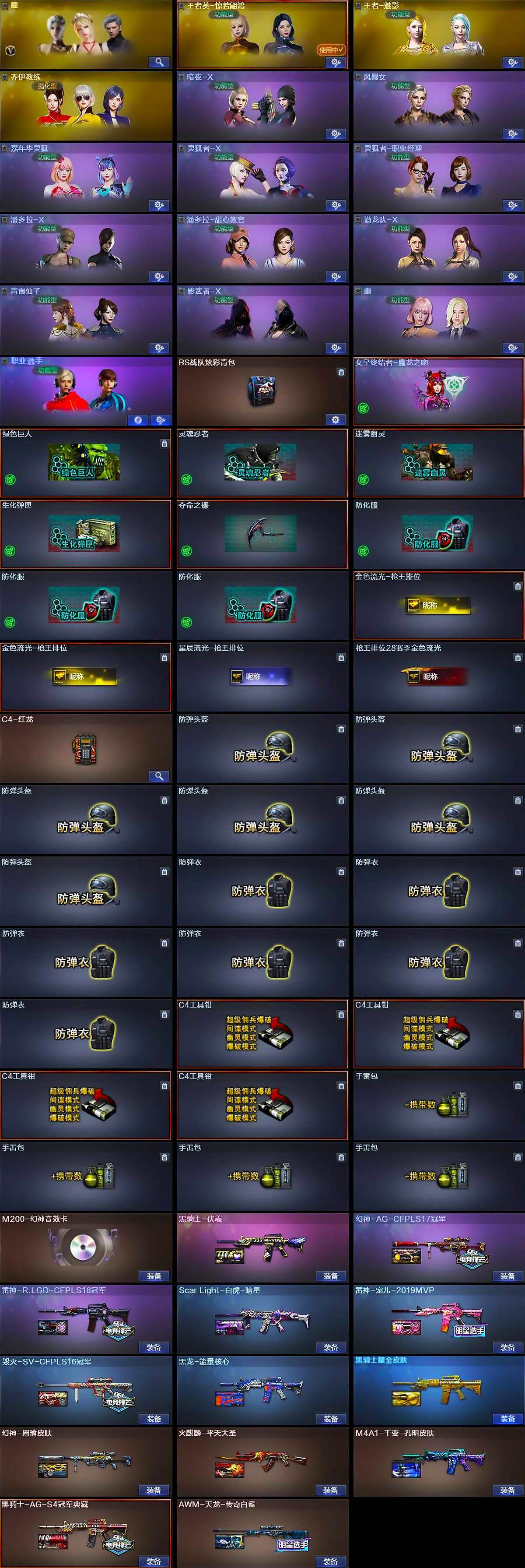 【道具】:BS战队炫彩背包,女皇终结者-魔龙之吻,绿色巨人,灵魂忍者,迷雾幽灵,生化弹匣,夺命之镰,防化服*3,金色流光-枪王排位*2,星辰流光-枪王排位,枪王排位28赛季金色流光,C4-红龙,防弹头盔*6,防弹衣*6,C4工具钳*4,手雷包*4