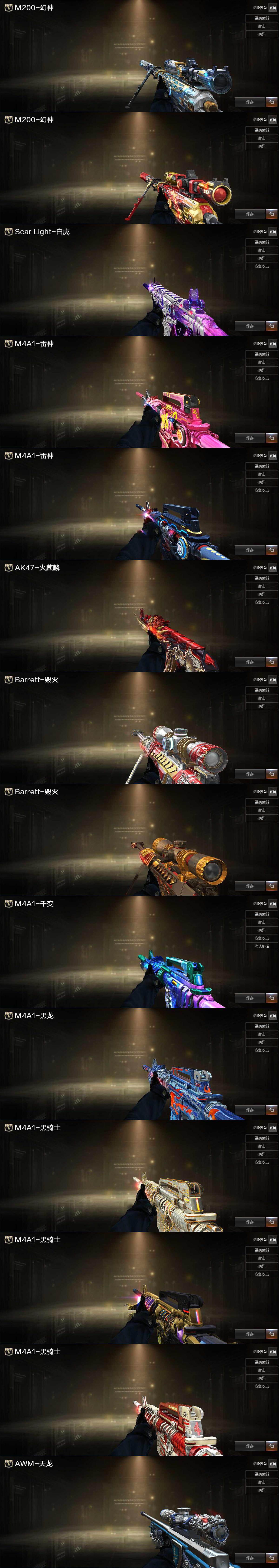 【热门武器】:QBZ03-金色蔷薇,Scar Light-白虎,HK417-朱雀,M200-幻神,M4A1-黑骑士,汤姆逊-烈龙*4,金刚伞