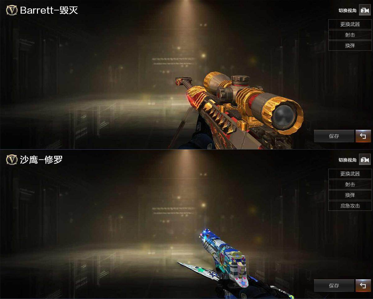 【英雄级武器】:M4A1-雷神,无影-神兵利器,黑武士-锦绣游龙,超新星-热带奇洋,QBZ03-金色蔷薇,Barrett-毁灭,M200-幻神,沙鹰-修罗,修罗-云海游龙,屠龙,炽芒蝶刃,龙啸-热带奇洋,高爆手雷-幻灵,手雷-云海游龙,手雷-热带奇洋,闪光弹-幻灵,烟雾弹-幻灵