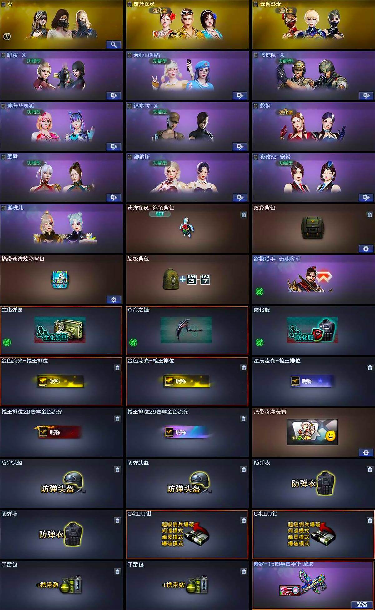 【道具】:奇洋探员-海龟背包,炫彩背包,热带奇洋炫彩背包,超级背包,终极猎手-秦魂将军,生化弹匣,夺命之镰,防化服,金色流光-枪王排位*2,星辰流光-枪王排位,枪王排位28赛季金色流光,枪王排位29赛季金色流光,热带奇洋表情,防弹头盔*2,防弹衣*2,C4工具钳*2,手雷包*2