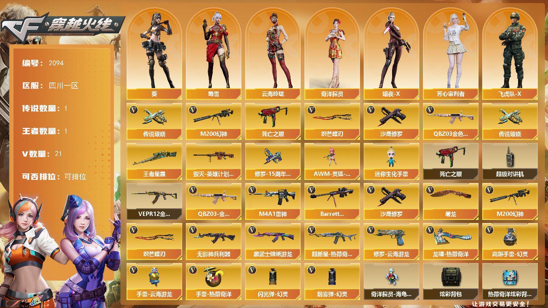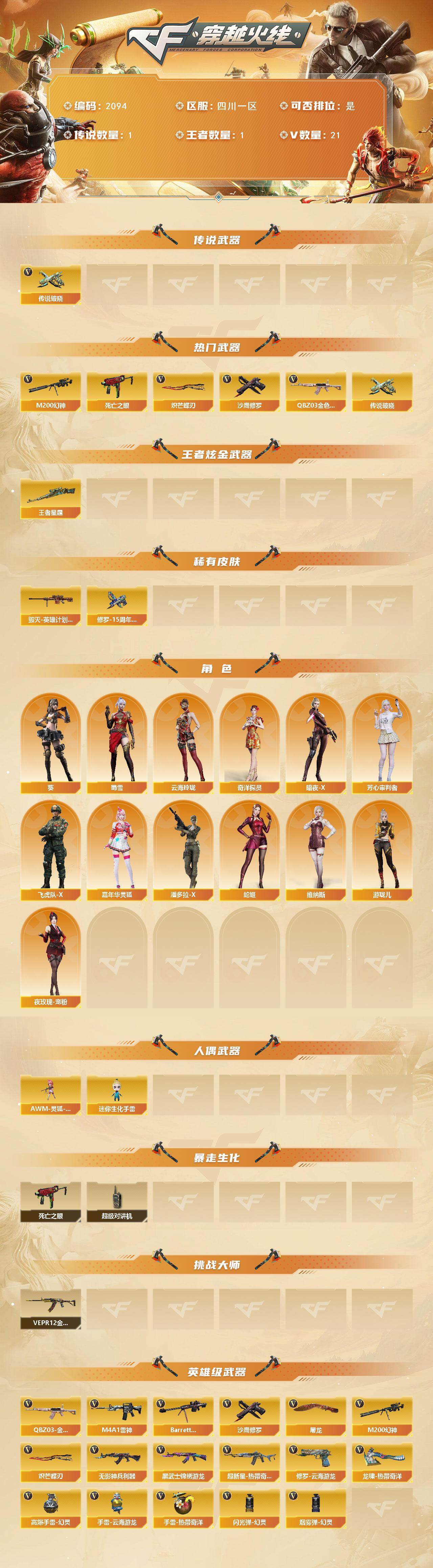 [16681878]四川一区-18V-1王者武器数-0炫金武器数 【传说武器】:传说破晓 【热门武器】:传说破晓,QBZ03-金色蔷薇,M200-幻神,死亡之眼,沙鹰-修罗,炽芒蝶刃 【王者炫金武器】:王者星霆 【皮肤】:毁灭-英雄计划 皮肤,修罗-15周年嘉年华 皮肤 【角色】:葵,奇洋探员,云海玲珑,暗夜-X,芳心审判者,飞虎队-X,嘉年华灵狐,潘多拉-X,蛇姬,蜀雪,维纳斯,夜玫瑰-宠粉,游珑儿 【人偶武器】:AWM-灵狐-15周年嘉年华,迷你生化手雷 【暴走生化】:死亡之眼,超级对讲机 【挑战大师】:VEPR-12-金魔 【英雄级武器】:M4A1-雷神,无影-神兵利器,黑武士-锦绣游龙,超新星-热带奇洋,QBZ03-金色蔷薇,Barrett-毁灭,M200-幻神,沙鹰-修罗,修罗-云海游龙,屠龙,炽芒蝶刃,龙啸-热带奇洋,高爆手雷-幻灵,手雷-云海游龙,手雷-热带奇洋,闪光弹-幻灵,烟雾弹-幻灵 【道具】:奇洋探员-海龟背包,炫彩背包,热带奇洋炫彩背包,超级背包,终极猎手-秦魂将军,生化弹匣,夺命之镰,防化服,金色流光-枪王排位*2,星辰流光-枪王排位,枪王排位28赛季金色流光,枪王排位29赛季金色流光,热带奇洋表情,防弹头盔*2,防弹衣*2,C4工具钳*2,手雷包*2 【特殊枪械】: