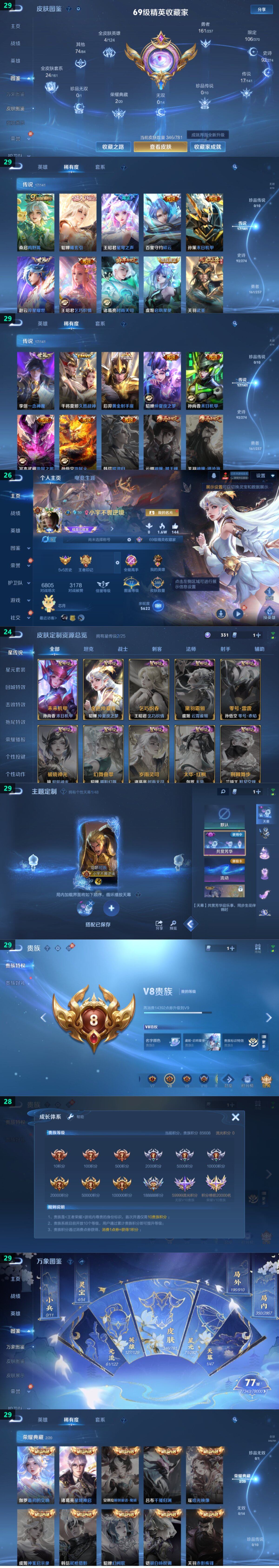 - [11491717]V8 1典藏 10传说 126英雄 232皮肤 典藏英雄武则天 可修改实名 优质装备:全息碎影(猴子典藏),冠军飞将,久胜战神,云霓雀翎,地狱火,海洋之心 传说皮:乘龙·铭钟鼎(赵云年限) 珍宝阁皮:女武神 限定皮:至尊宝,凤求凰(白切鸡),武陵仙君(小桃花),神威(电光马子),遇见飞天,五谷丰年,青龙志(铠年限),冰锋战神,游园惊梦,天狼狩猎者,李小龙,逐梦之光,如梦令-后羿,一生所爱,大圣娶亲,天魔缭乱,青春决赛季,冰霜恋舞曲,蜜橘之夏 史诗皮:赞萌露比,龙之律动,石田雨龙,守夜人,紫霞仙子,苍穹之光,白龙吟,黄金分割率,特工魅影,千年之狐,魅语,冰冠公主,偶像歌手,晚萤,猫狗日记-孙策,时之恋人-孙尚香,乱世虎臣,修罗,女仆咖啡,摇滚巨星,水果甜心,天才门将,星夜王子,功夫厨神,德古拉伯爵,暗隐猎兽者,幽灵船长,心灵战警,舞动绿茵,纤云弄巧,繁星吟游(呼啦呼啦),乘风破浪,逐浪之夏,水晶猎龙者,原初追逐者,圣诞狂欢,圣诞恋歌,鹰眼统帅,暗夜贵公子,魅力维加斯