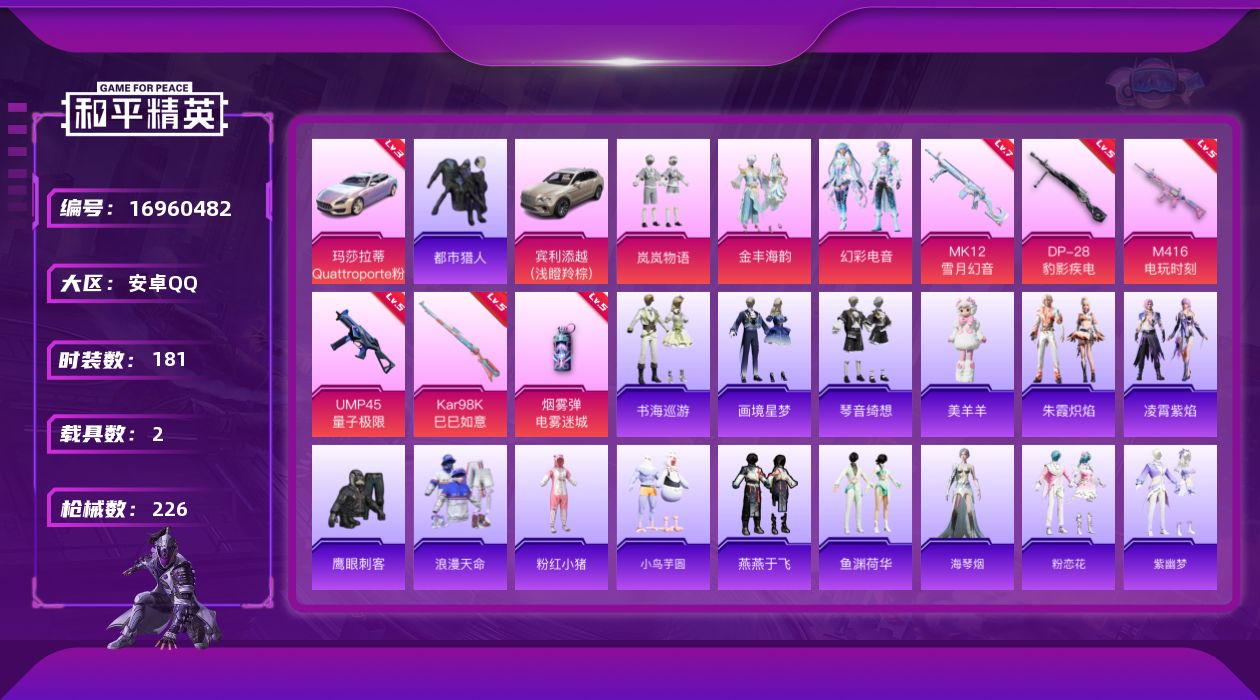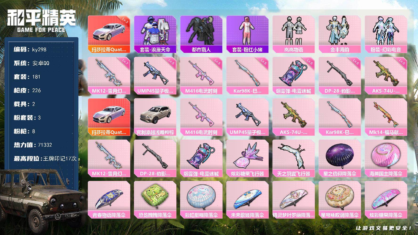 [16960482]安卓 手Q-3粉装-8特效枪-2载具-3粉色飞行器-71332热力值-17王牌印记-181套装-226枪皮 【红色载具】:玛莎拉蒂Quattroporte(幻星粉)(三级) 【热门品类】:套装-浪漫天命,套装-都市猎人,套装-粉红小猪 【粉色套装】:粉装-岚岚物语,粉装-金丰海韵,粉装-幻彩电音 【粉色枪皮等级】:M416-电玩时刻(五级),UMP45-量子极限(五级),AKS-74U-森灵之息(五级),Kar98K-巳巳如意(五级),MK12-雪月幻音(七级),DP-28-豹影疾电(五级),烟雾弹-电雾迷城(五级) 【粉色载具】:玛莎拉蒂Quattroporte(幻星粉),宾利添越(浅瞪羚棕) 【粉色枪皮】:M416-电玩时刻,UMP45-量子极限,AKS-74U-森灵之息,Kar98K-巳巳如意,Mk14-福马献瑞,MK12-雪月幻音,DP-28-豹影疾电,烟雾弹-电雾迷城 【粉色飞行器】:炫彩糖果飞行器,天之羽翼飞行器 【粉色降落伞】:星之信仰降落伞,海渊国主降落伞,青春物语降落伞,恐龙拽拽降落伞,彩虹甜喵降落伞,未来歌姬降落伞,精灵梦叶罗丽降落伞,星穹咏叹调降落伞,炫彩糖果降落伞 【稀有套装】:套装-小鸟芋圆,套装-雪国风尚,套装-炫彩糖果,套装-燕燕于飞,套装-鱼渊荷华,角色-海琴烟,套装-粉恋花,套装-紫幽梦,套装-蓝冰羽,套装-星影赞美诗,套装-彩虹兔,套装-云朵鹅,套装-雪绒豹,角色-乐音,角色-绛羽幽主,套装-朱霞炽焰,套装-凌霄紫焰,玩偶服-美羊羊,套装-书海巡游,套装-画境星梦,套装-琴音绮想 【稀有枪皮】:AUG-冰晶雪宝,AKM-夜灯,AKM-彩虹符号,AKM-影袭,AKM-恐龙拽拽,AKM-灼热熔岩,AKM-生命誓言,AKM-破晓战魂,AKM-萌趣颜团子,AKM-虎虎生威,AKM-霓虹街区,M16A4-幻世战舞者,SCAR-L-夜灯,SCAR-L-暗夜玫瑰,SCAR-L-玉兔迎春,SCAR-L-红色方程式,SCAR-L-龙宫之主,M416-夜灯,M416-糯团青竹,M416-红色方程式,M416-绯红前夜,M416-蓝色火焰,M416-黄金龙骨,GROZA-异彩先驱,GROZA-彩虹符号,GROZA-影袭,GROZA-生命誓言,GROZA-田园牧歌,GROZA-荧海星豚,AUG-天降萌叽,AUG-甜蜜菠萝,AUG-耀粉歌者,AUG-青春