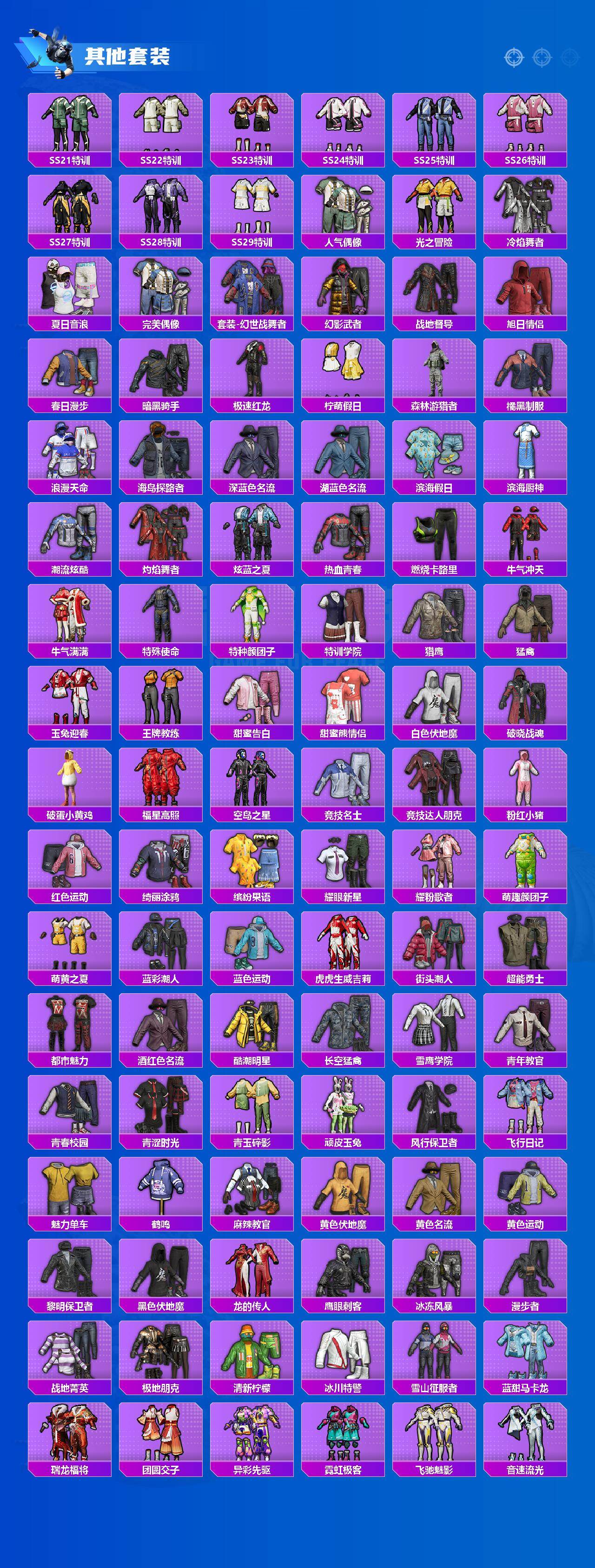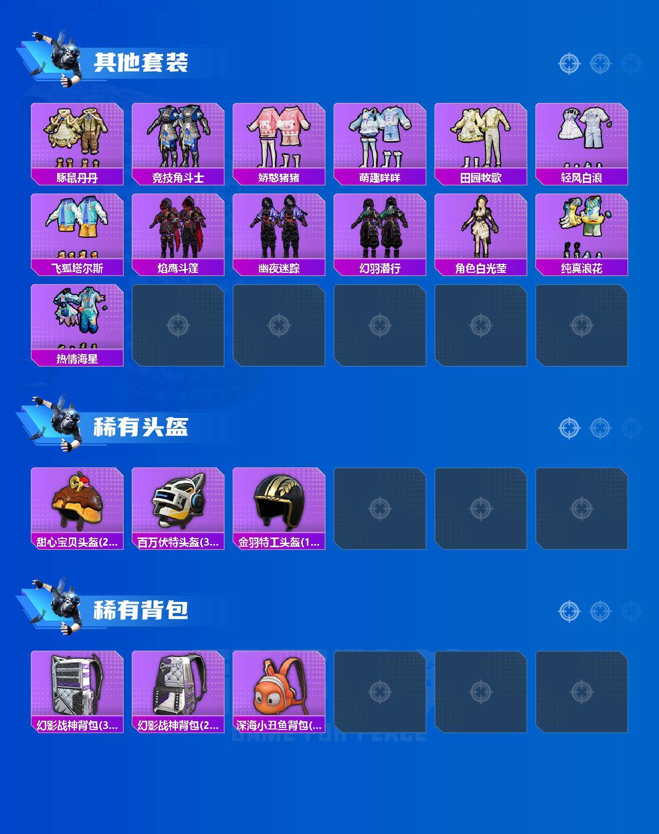 【稀有枪皮】:AUG-冰晶雪宝,AKM-夜灯,AKM-彩虹符号,AKM-影袭,AKM-恐龙拽拽,AKM-灼热熔岩,AKM-生命誓言,AKM-破晓战魂,AKM-萌趣颜团子,AKM-虎虎生威,AKM-霓虹街区,M16A4-幻世战舞者,SCAR-L-夜灯,SCAR-L-暗夜玫瑰,SCAR-L-玉兔迎春,SCAR-L-红色方程式,SCAR-L-龙宫之主,M416-夜灯,M416-糯团青竹,M416-红色方程式,M416-绯红前夜,M416-蓝色火焰,M416-黄金龙骨,GROZA-异彩先驱,GROZA-彩虹符号,GROZA-影袭,GROZA-生命誓言,GROZA-田园牧歌,GROZA-荧海星豚,AUG-天降萌叽,AUG-甜蜜菠萝,AUG-耀粉歌者,AUG-青春