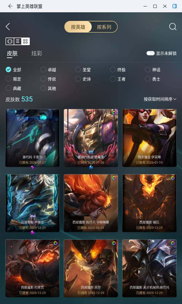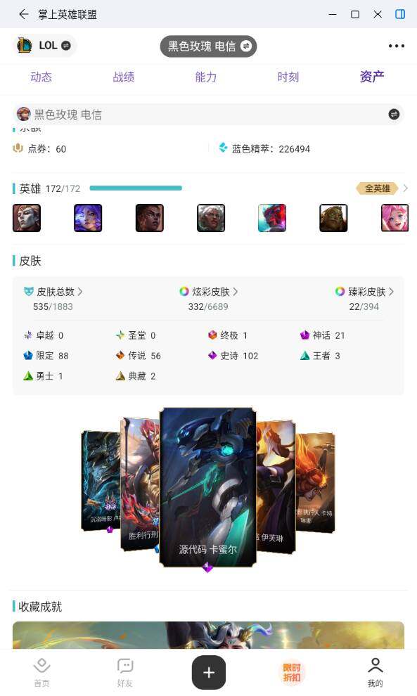 [16964756]未定级段位-172英雄-535皮肤-332炫彩-1终极-21神话-88限定-56传说-102史诗