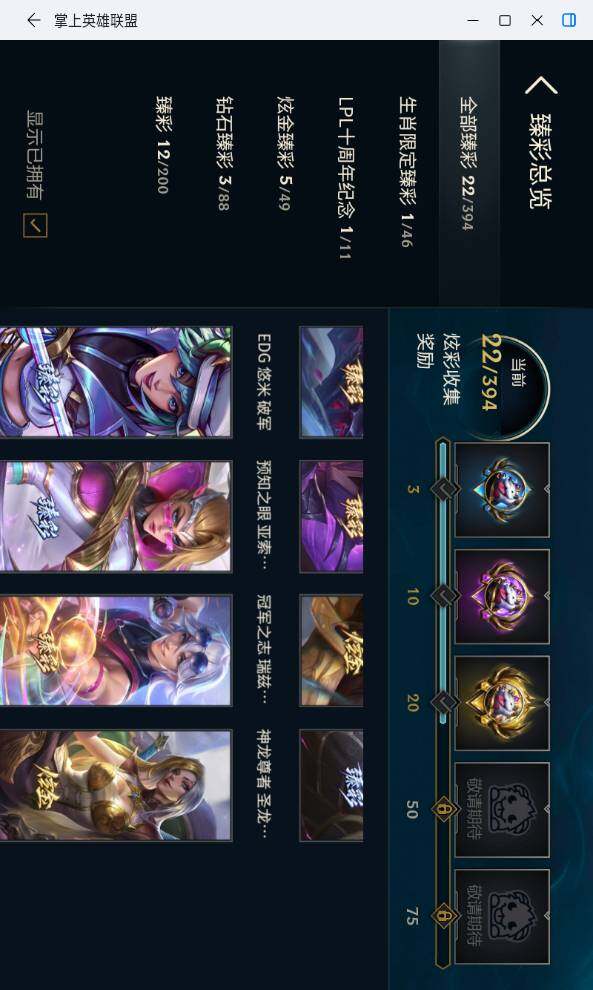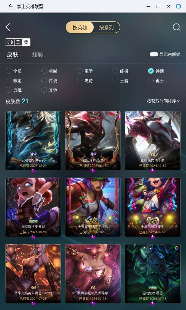 【神话皮肤】:十周年纪念安妮,源代码乐芙兰,十五周年纪念希维尔,水晶圣骑艾希,神凰行者瑞羽圣凰艾尼维亚,殿堂传奇薇恩,沉溺暗影卢锡安,海克斯科技安妮,海克斯科技崔丝塔娜,海克斯科技克格莫,海克斯科技雷克顿,摄魂使者薇恩,至臻征服者贾克斯,至臻剪纸仙灵希维尔,至臻KDA卡莎,至臻烈焰美人薇恩,至臻烈焰美人薇恩2022,至臻灵能特工伊泽瑞尔,至臻魅惑女巫厄运小姐,至臻魔女阿卡丽,至臻月蚀骑士赛娜
