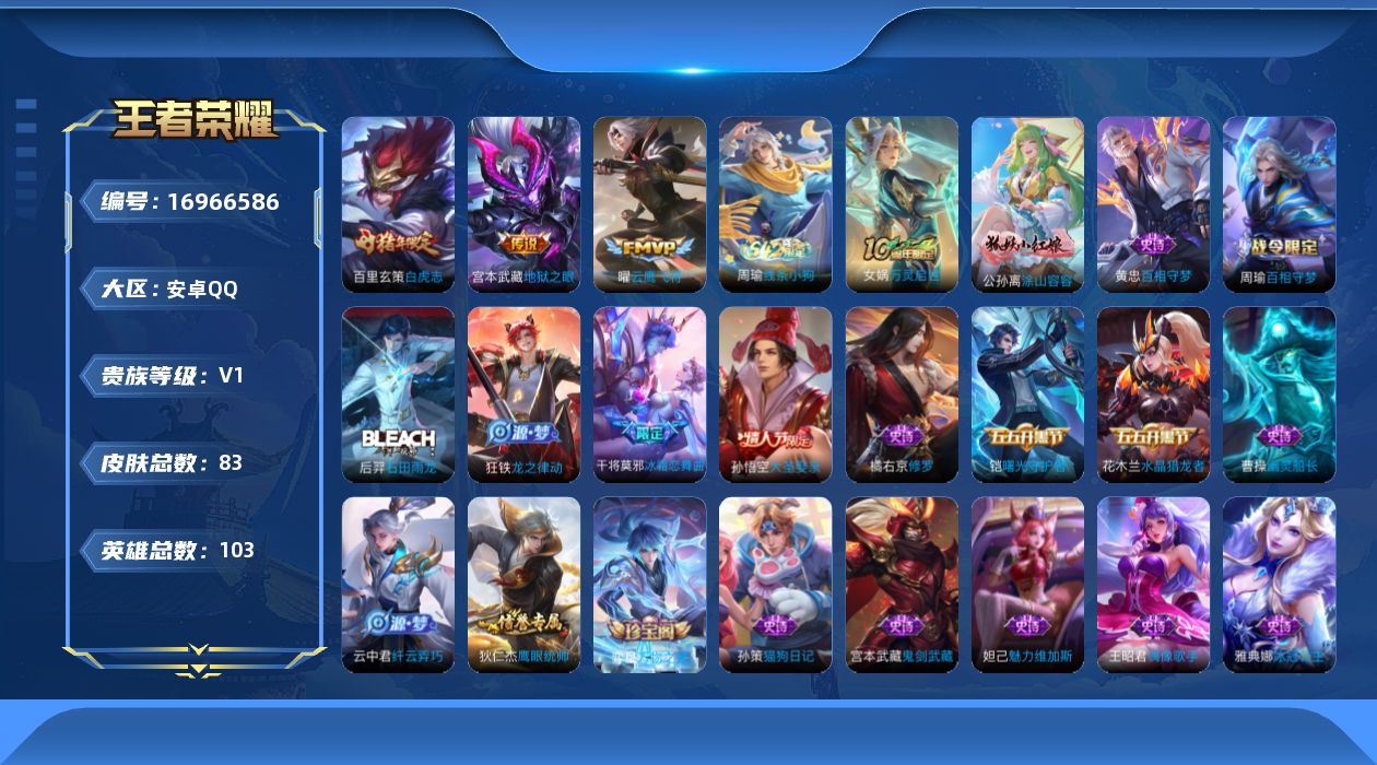 [16966586]安卓Q-83皮肤-3传说-20史诗 【传说皮肤】:曜云鹰飞将,百里玄策白虎志,宫本武藏地狱之眼 【限定皮肤】:狄仁杰阴阳师,狄仁杰万华元夜,达摩沙漠行僧,项羽海滩派对,老夫子醍醐杖,程咬金演武夺筹,孙悟空大圣娶亲,钟馗驱傩正仪,干将莫邪冰霜恋舞曲,鬼谷子原初探秘者,百里玄策白虎志,弈星混沌棋,沈梦溪大漠名商,明世隐疑决卦,云中君纤云弄巧,鬼谷子天穹祈灯 【年限皮肤】:百里玄策白虎志 【赛季限定】:弈星混沌棋,明世隐疑决卦,老夫子醍醐杖,鬼谷子原初探秘者,狄仁杰万华元夜,程咬金演武夺筹,钟馗驱傩正仪,达摩沙漠行僧,沈梦溪大漠名商,鬼谷子天穹祈灯,钟馗虚灵犬护,甄姬逆浪荇歌,亚瑟荣光之誓 【战令限定】:周瑜百相守梦,孙策百相守梦,周瑜线条小狗 【史诗皮肤】:王昭君偶像歌手,宫本武藏鬼剑武藏,妲己魅力维加斯,曹操幽灵船长,花木兰水晶猎龙者,雅典娜冰冠公主,铠曙光守护者,孙策猫狗日记,干将莫邪冰霜恋舞曲,孙悟空大圣娶亲,狄仁杰鹰眼统帅,橘右京修罗,云中君纤云弄巧,弈星万物之道,狂铁龙之律动,后羿石田雨龙,周瑜百相守梦,黄忠百相守梦,公孙离涂山容容,女娲万灵启世,周瑜线条小狗 【其他皮肤】:项羽海滩派对,韩信教廷特使,赵云白执事,赵云忍炎影,牛魔西部大镖客,安琪拉玩偶对对碰,妲己少女阿狸,亚瑟死亡骑士,达摩拳王,花木兰兔女郎,狄仁杰阴阳师,关羽龙腾万里,钟无艳海滩丽影,狂铁命运角斗场,老夫子功夫老勺,弈星混沌棋,哪吒次元突破,明世隐疑决卦,盾山圆桌骑士,老夫子醍醐杖,鬼谷子原初探秘者,狄仁杰万华元夜,程咬金演武夺筹,张良缤纷绘卷,钟馗驱傩正仪,鲁班大师乓乓大师,达摩沙漠行僧,沈梦溪大漠名商,后羿完美运算,鬼谷子天穹祈灯,姜子牙星梦巡礼,钟馗虚灵犬护,阿古朵布丁狗之约,白起死霸装,甄姬逆浪荇歌,孙策百相守梦,庄周锦麟游梦,莱西奥踏浪烽翎,亚瑟荣光之誓,艾琳鹤鸣心笺,项羽帝国元帅,孙悟空西部大镖客,李元芳特种部队,夏侯惇战争骑士,苍维京掠夺者,杨戬埃及法老,百里玄策威尼斯狂欢,苏烈爱与和平,公孙离花间舞,裴擒虎街头旋风,元歌午夜歌剧院,李信灼热之刃,盘古创世神祝,云中君荷鲁斯之眼,曜归虚梦演,马超幸存者,澜孤猎,云缨赤焰之缨,暃碧珀绯影 【营地ID】:2142019446