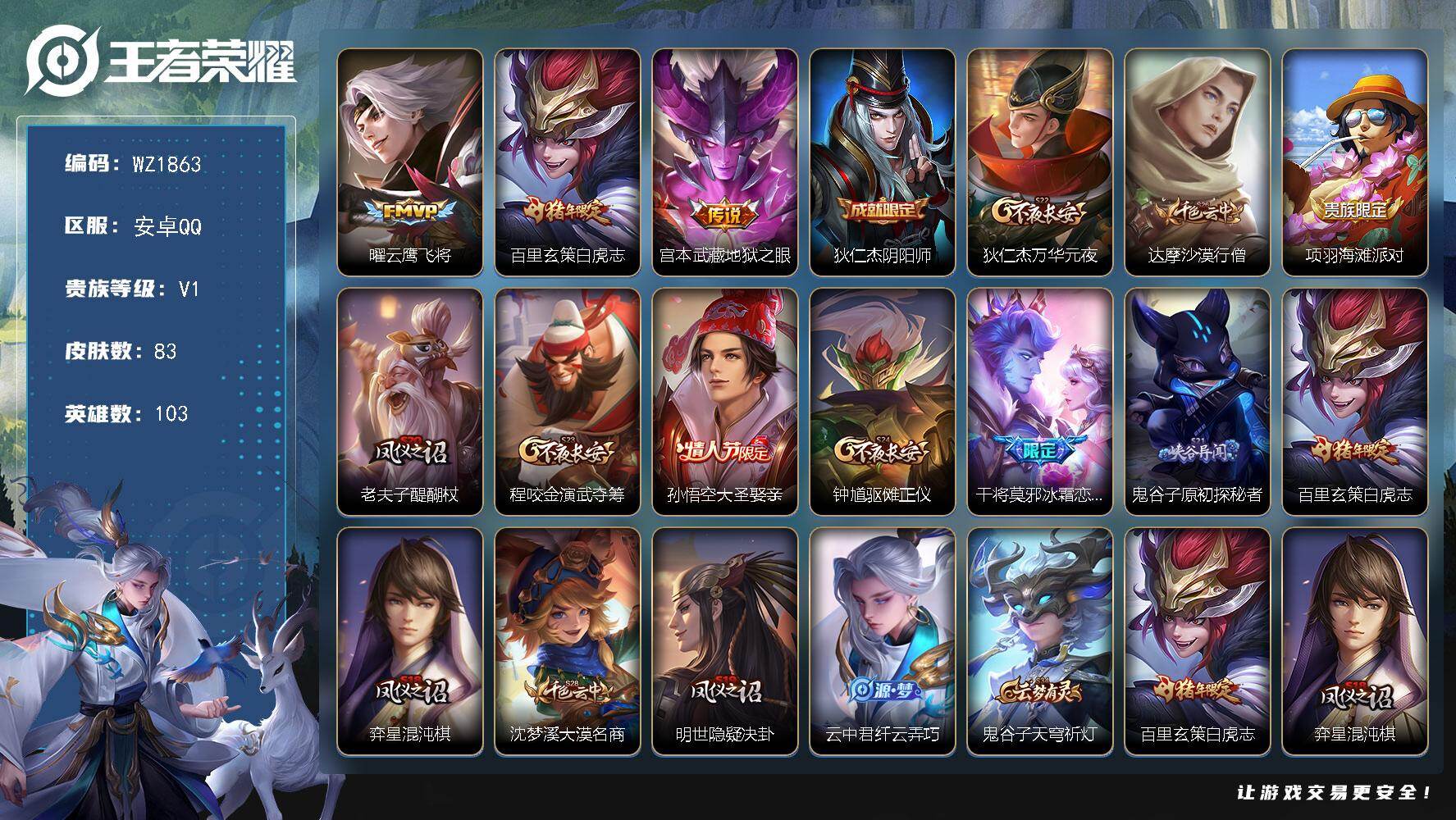 - [16329517]安卓Q-V9-荣耀黄金I段位-128英雄-400皮肤-1典藏皮肤-1典藏英雄-34传说-111史诗-2星传 【英雄全皮】:孙权全皮,司空震全皮,空空儿全皮,影全皮 【荣耀典藏】:武则天英雄,诸葛亮星域神启 【传说皮肤】:后羿神树通天,杨玉环星之鸣奏,司空震愿照山河定,女娲愿照千秋盛,妲己愿照众生和,澜愿照九州拓,蔡文姬愿照福禄聚,虞姬愿照岁时盈,桑启鸣野蒿,铠冥王哈迪斯,墨子黄金天蝎座,貂蝉曦玄引,孙策乘龙淬吴钩,赵云乘龙铭钟鼎,孙悟空齐天大圣,吕布怒海麟威,李白诗剑行,百里守约碎云,西施游龙清影,小乔音你心动,虞姬启明星使,孙悟空零号赤焰,曜云鹰飞将,李信一念神魔,刘备时之恋人,貂蝉猫影幻舞,干将莫邪久胜战神,虞姬云霓雀翎,后羿黄金射手座,孙尚香末日机甲,宫本武藏地狱之眼,孙悟空地狱火,武则天海洋之心,狄仁杰超时空战士 【限定皮肤】:铠冥王哈迪斯,蒙犽顽岩魄,蔡文姬夏日便利店,大乔绒语心约,虞姬夏日便利店,狄仁杰阴阳师,赵云皇家上将,赵云龙胆,墨子降魔,嬴政白昼王子,高渐离玩趣恶龙,钟无艳超时空战士,扁鹊奇幻香踪,芈月重明,芈月幻夜卜梦,吕布猎兽之王,周瑜赤莲之焰,元歌云间偶戏,元歌无心,夏侯惇朔风刀,甄姬游园惊梦,甄姬落雪兰心,曹操烛龙,典韦穷奇,典韦蓝屏警告,典韦岱宗,马可波罗暗影游猎,马可波罗山海玄木吟,狄仁杰魔术师,达摩沙漠行僧,项羽海滩派对,老夫子醍醐杖,王昭君午后时光,兰陵王驯魔猎人,亚瑟潮玩骑士王,孙悟空零号赤焰,孙悟空孙行者,孙悟空齐天大圣,后羿圣弓游侠,李元芳云中旅人,虞姬启明星使,杨戬潮玩骑兵,女娲朔望之晖,蔡文姬繁星吟游,鬼谷子原初探秘者,鬼谷子五谷丰年,黄忠烈魂,黄忠火炮绅士,铠青龙志,沈梦溪大漠名商,裴擒虎李小龙,裴擒虎擒涛扼浪,狂铁电玩高手,云中君纤云弄巧,猪八戒西部大镖客,上官婉儿梁祝,嫦娥拒霜思,嫦娥暖冬兔眠,鲁班大师探海日志,桑启海盐诗旅,艾琳流音漫舞,司空震地狱燃心,阿古朵江河有灵,高渐离燃音魔法,妲己灵卜魔法,鬼谷子天穹祈灯,伽罗琥珀纪元,大乔乘龙忆丹青,安琪拉乘龙聚宝船,孙策乘龙淬吴钩,赵云乘龙铭钟鼎,貂蝉曦玄引,沈梦溪龙舞盛年,鲁班七号蔬乡物语,李元芳蔬乡物语,程咬金群星魔术团,项羽苍威无极,刘备异域游侠 【年限皮肤】:铠青龙志,典韦岱宗,黄忠烈魂,赵云龙胆,马可波罗山海玄木吟,大乔乘龙忆丹青,安琪拉乘龙聚宝船,孙策乘龙