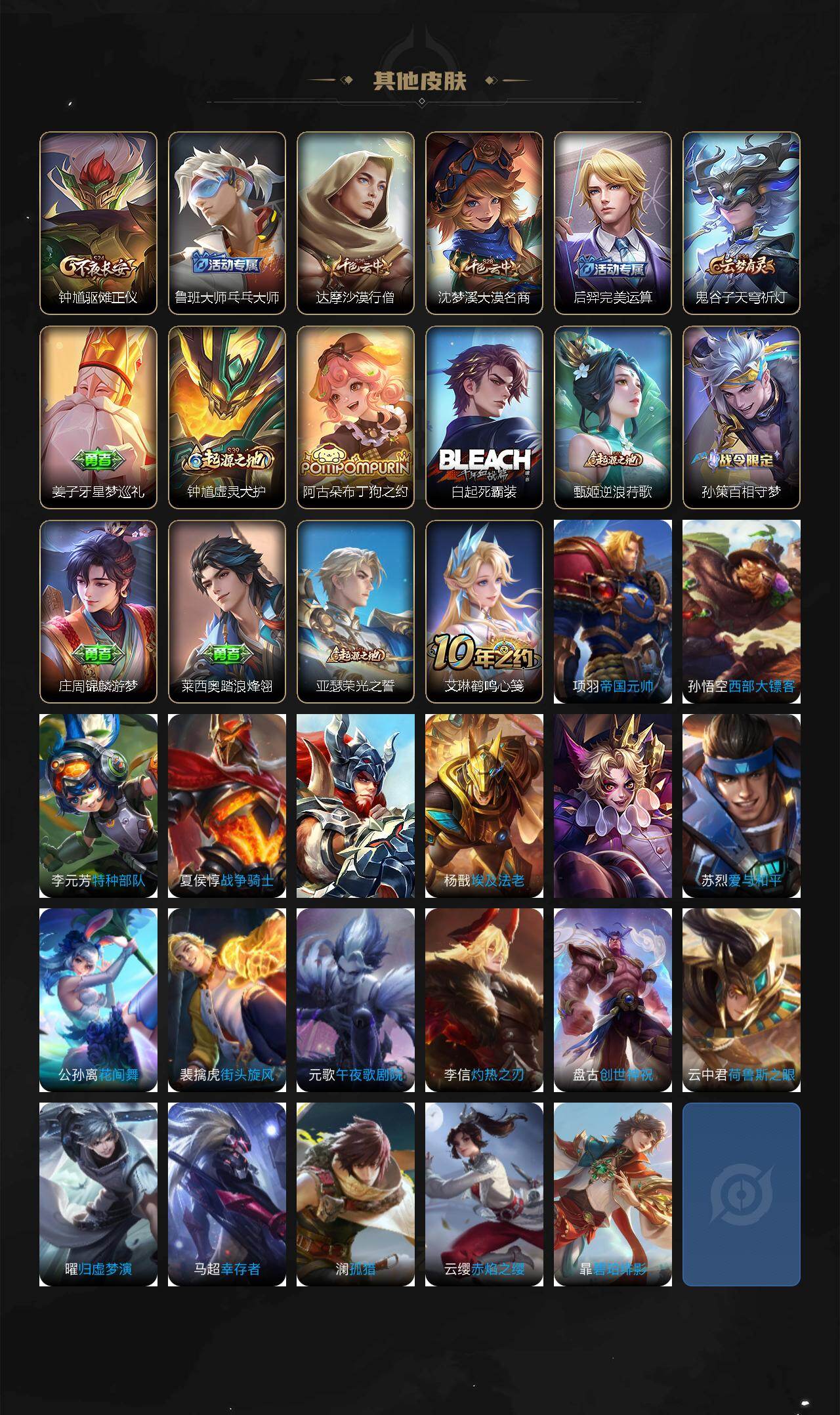 【其他皮肤】:项羽海滩派对,韩信教廷特使,赵云白执事,赵云忍炎影,牛魔西部大镖客,安琪拉玩偶对对碰,妲己少女阿狸,亚瑟死亡骑士,达摩拳王,花木兰兔女郎,狄仁杰阴阳师,关羽龙腾万里,钟无艳海滩丽影,狂铁命运角斗场,老夫子功夫老勺,弈星混沌棋,哪吒次元突破,明世隐疑决卦,盾山圆桌骑士,老夫子醍醐杖,鬼谷子原初探秘者,狄仁杰万华元夜,程咬金演武夺筹,张良缤纷绘卷,钟馗驱傩正仪,鲁班大师乓乓大师,达摩沙漠行僧,沈梦溪大漠名商,后羿完美运算,鬼谷子天穹祈灯,姜子牙星梦巡礼,钟馗虚灵犬护,阿古朵布丁狗之约,白起死霸装,甄姬逆浪荇歌,孙策百相守梦,庄周锦麟游梦,莱西奥踏浪烽翎,亚瑟荣光之誓,艾琳鹤鸣心笺,项羽帝国元帅,孙悟空西部大镖客,李元芳特种部队,夏侯惇战争骑士,苍维京掠夺者,杨戬埃及法老,百里玄策威尼斯狂欢,苏烈爱与和平,公孙离花间舞,裴擒虎街头旋风,元歌午夜歌剧院,李信灼热之刃,盘古创世神祝,云中君荷鲁斯之眼,曜归虚梦演,马超幸存者,澜孤猎,云缨赤焰之缨,暃碧珀绯影