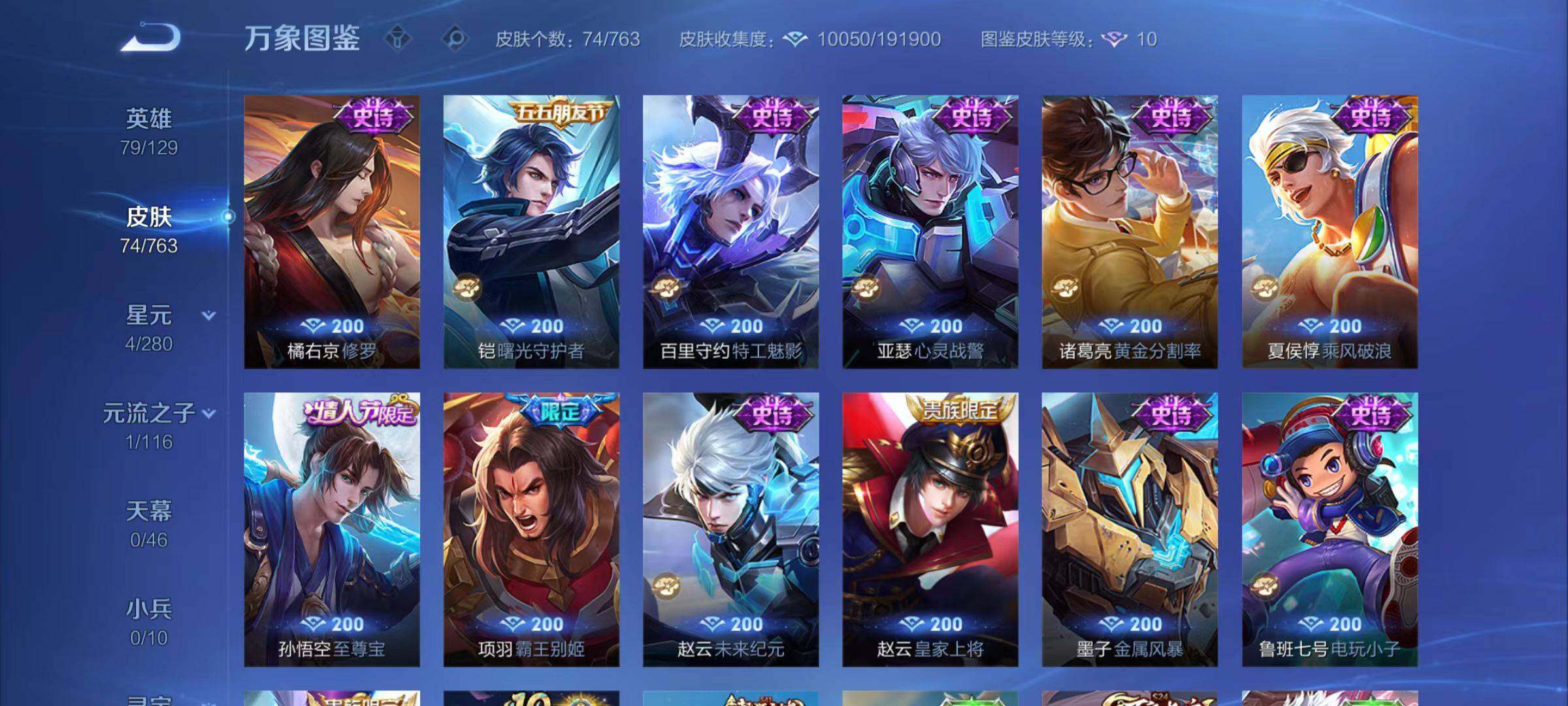 【史诗皮肤】:鲁班七号电玩小子,赵云皇家上将,赵云未来纪元,狄仁杰魔术师,墨子金属风暴,项羽霸王别姬,孙悟空至尊宝,夏侯惇乘风破浪,诸葛亮黄金分割率,亚瑟心灵战警,百里守约特工魅影,铠曙光守护者,狄仁杰鹰眼统帅,橘右京修罗,赵云龙胆,裴擒虎李小龙,云中君纤云弄巧,孙膑天狼运算者,花木兰默契交锋,女娲万灵启世