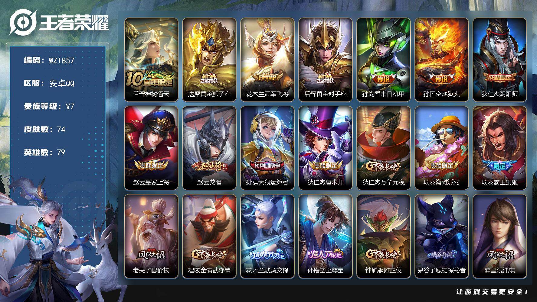 [16967229]安卓Q-74皮肤-6传说-20史诗 【传说皮肤】:后羿神树通天,达摩黄金狮子座,花木兰冠军飞将,后羿黄金射手座,孙尚香末日机甲,孙悟空地狱火 【限定皮肤】:狄仁杰阴阳师,赵云皇家上将,赵云龙胆,孙膑天狼运算者,狄仁杰魔术师,狄仁杰万华元夜,项羽海滩派对,项羽霸王别姬,老夫子醍醐杖,程咬金演武夺筹,花木兰默契交锋,孙悟空至尊宝,钟馗驱傩正仪,鬼谷子原初探秘者,弈星混沌棋,明世隐疑决卦,裴擒虎李小龙,云中君纤云弄巧 【赛季限定】:弈星混沌棋,明世隐疑决卦,老夫子醍醐杖,鬼谷子原初探秘者,狄仁杰万华元夜,程咬金演武夺筹,钟馗驱傩正仪,亚瑟荣光之誓 【史诗皮肤】:鲁班七号电玩小子,赵云皇家上将,赵云未来纪元,狄仁杰魔术师,墨子金属风暴,项羽霸王别姬,孙悟空至尊宝,夏侯惇乘风破浪,诸葛亮黄金分割率,亚瑟心灵战警,百里守约特工魅影,铠曙光守护者,狄仁杰鹰眼统帅,橘右京修罗,赵云龙胆,裴擒虎李小龙,云中君纤云弄巧,孙膑天狼运算者,花木兰默契交锋,女娲万灵启世 【其他皮肤】:项羽海滩派对,阿轲爱心护理,芈月红桃皇后,程咬金爱与正义,典韦黄金武士,亚瑟死亡骑士,刘备万事如意,狄仁杰阴阳师,刘备汉昭烈帝,狂铁命运角斗场,孙尚香沉稳之力,诸葛亮掌控之力,庄周奇妙博物学,小乔丁香结,姜子牙炽热元素使,弈星混沌棋,明世隐疑决卦,老夫子醍醐杖,廉颇无尽征程,鬼谷子原初探秘者,狄仁杰万华元夜,露娜瓷语鉴心,程咬金演武夺筹,张良缤纷绘卷,盘古重装意志,钟馗驱傩正仪,莱西奥西部游侠,亚瑟荣光之誓,艾琳鹤鸣心笺,鲁班七号福禄兄弟,高渐离金属狂潮,貂蝉异域舞娘,曹操超能战警,孙膑未来旅行,孙悟空西部大镖客,刘邦圣殿之光,夏侯惇战争骑士,马可波罗激情绿茵,杨戬埃及法老,诸葛亮星航指挥官,百里守约绝影神枪,梦奇美梦成真,裴擒虎街头旋风,沈梦溪棒球奇才,李信灼热之刃,猪八戒年年有余,盘古创世神祝,马超幸存者 【营地ID】:1865631501