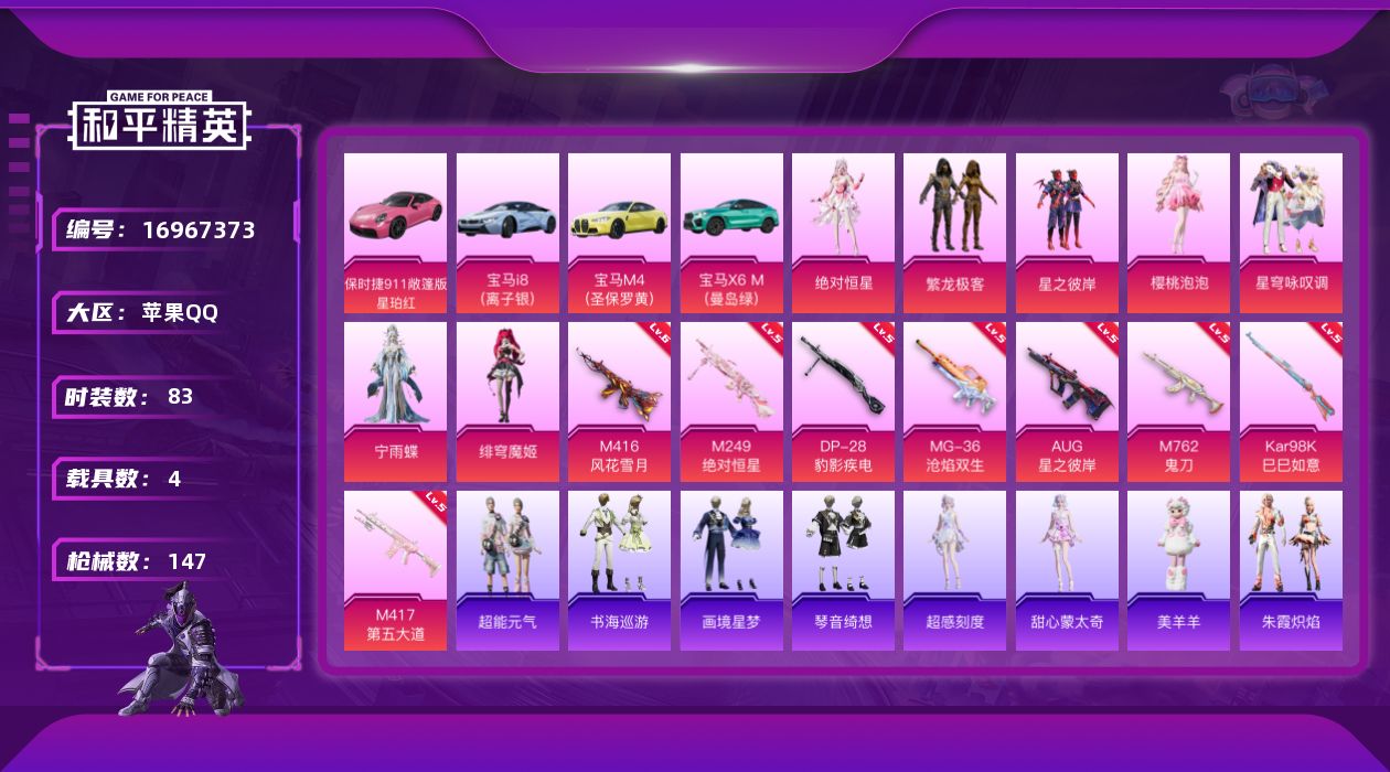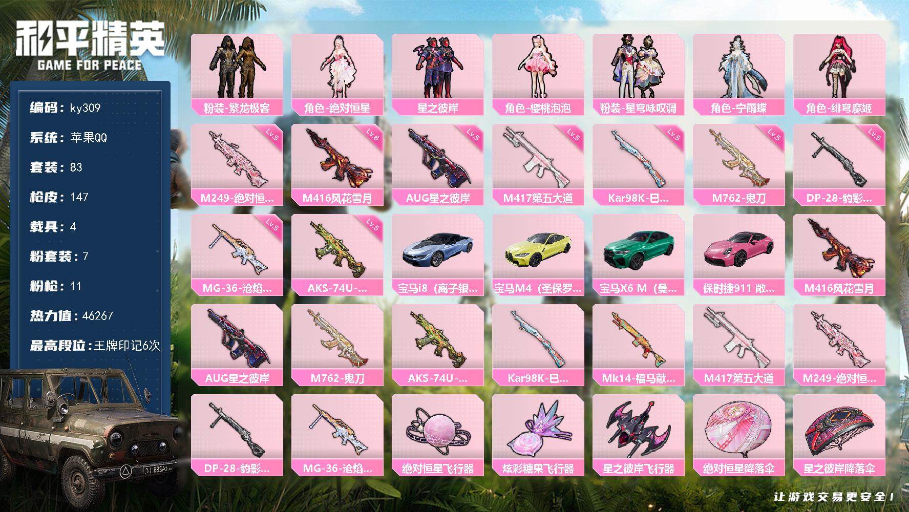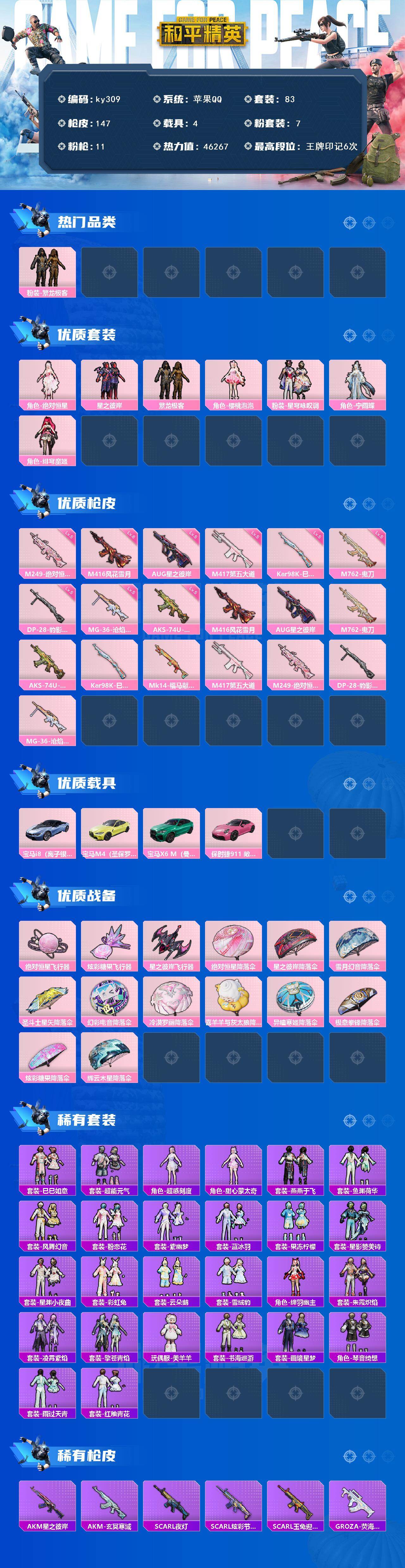 [16967373]苹果 手Q-7粉装-11特效枪-4载具-3粉色飞行器-46267热力值-6王牌印记-83套装-147枪皮 【热门品类】:粉装-繁龙极客 【粉色套装】:角色-绝对恒星,粉装-星之彼岸,粉装-繁龙极客,角色-樱桃泡泡,粉装-星穹咏叹调,角色-宁雨蝶,角色-绯穹魔姬 【粉色枪皮等级】:M416-风花雪月(六级),AUG-星之彼岸(五级),M762-鬼刀(五级),AKS-74U-森灵之息(五级),Kar98K-巳巳如意(五级),M417-第五大道(五级),M249-绝对恒星(五级),DP-28-豹影疾电(五级),MG-36-沧焰双生(五级) 【粉色载具】:宝马i8(离子银),宝马M4(圣保罗黄),宝马X6 M(曼岛绿),保时捷911 敞篷版(星珀红) 【粉色枪皮】:M416-风花雪月,AUG-星之彼岸,M762-鬼刀,AKS-74U-森灵之息,Kar98K-巳巳如意,Mk14-福马献瑞,M417-第五大道,M249-绝对恒星,DP-28-豹影疾电,MG-36-沧焰双生 【粉色飞行器】:绝对恒星飞行器,炫彩糖果飞行器,星之彼岸飞行器 【粉色降落伞】:绝对恒星降落伞,星之彼岸降落伞,雪月幻音降落伞,圣斗士星矢降落伞,幻彩电音降落伞,冷漠罗丽降落伞,喜羊羊与灰太狼降落伞,异瞳寒姬降落伞,极意拳锋降落伞,炫彩糖果降落伞,辉云木星降落伞 【稀有套装】:套装-巳巳如意,套装-超能元气,角色-超感刻度,角色-甜心蒙太奇,套装-雪国风尚,套装-炫彩糖果,套装-燕燕于飞,套装-鱼渊荷华,套装-风舞幻音,套装-粉恋花,套装-紫幽梦,套装-蓝冰羽,套装-果冻柠檬,套装-星影赞美诗,套装-星渊小夜曲,套装-彩虹兔,套装-云朵鹅,套装-雪绒豹,角色-绛羽幽主,套装-朱霞炽焰,套装-凌霄紫焰,套装-擎苍青焰,玩偶服-美羊羊,套装-书海巡游,套装-画境星梦,套装-琴音绮想,套装-雨过天青,套装-红釉青花 【稀有枪皮】:AUG-冰晶雪宝,AKM-星之彼岸,AKM-玄冥寒域,SCAR-L-夜灯,SCAR-L-炫彩节奏,SCAR-L-玉兔迎春,GROZA-荧海星豚,AUG-甜蜜菠萝,AUG-绝对恒星,M762-彩虹符号,M762-云朵鹅,Mk47-炫光之旅,G36C-星穹咏叹调,AC-VAL-天降萌叽,ACE32-画境星梦,ARX-凌霄紫焰,UZI-啾咪啾咪,UZI-炫彩节奏,UZI-月影灵韵,UMP45-