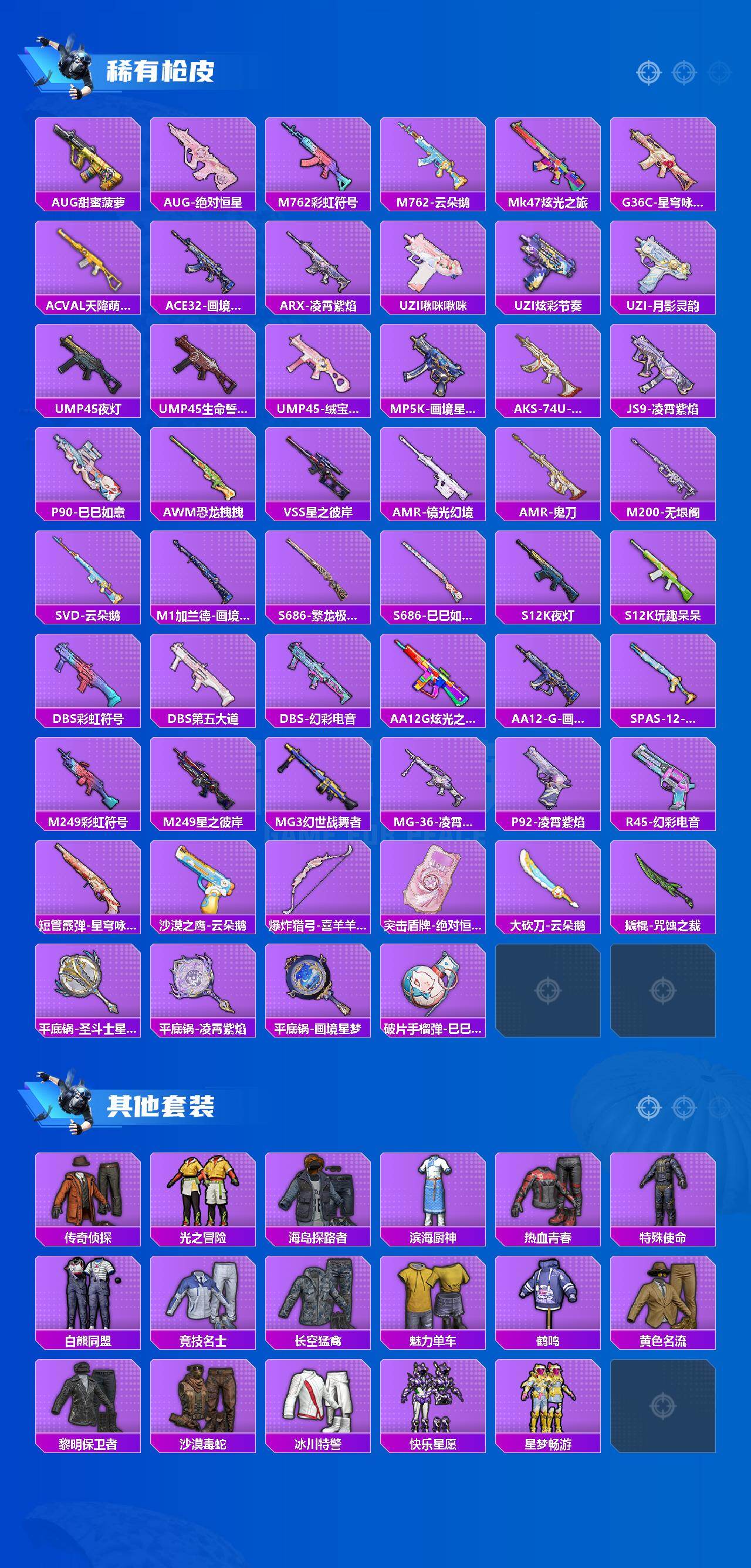 【稀有枪皮】:AUG-冰晶雪宝,AKM-星之彼岸,AKM-玄冥寒域,SCAR-L-夜灯,SCAR-L-炫彩节奏,SCAR-L-玉兔迎春,GROZA-荧海星豚,AUG-甜蜜菠萝,AUG-绝对恒星,M762-彩虹符号,M762-云朵鹅,Mk47-炫光之旅,G36C-星穹咏叹调,AC-VAL-天降萌叽,ACE32-画境星梦,ARX-凌霄紫焰,UZI-啾咪啾咪,UZI-炫彩节奏,UZI-月影灵韵,UMP45-