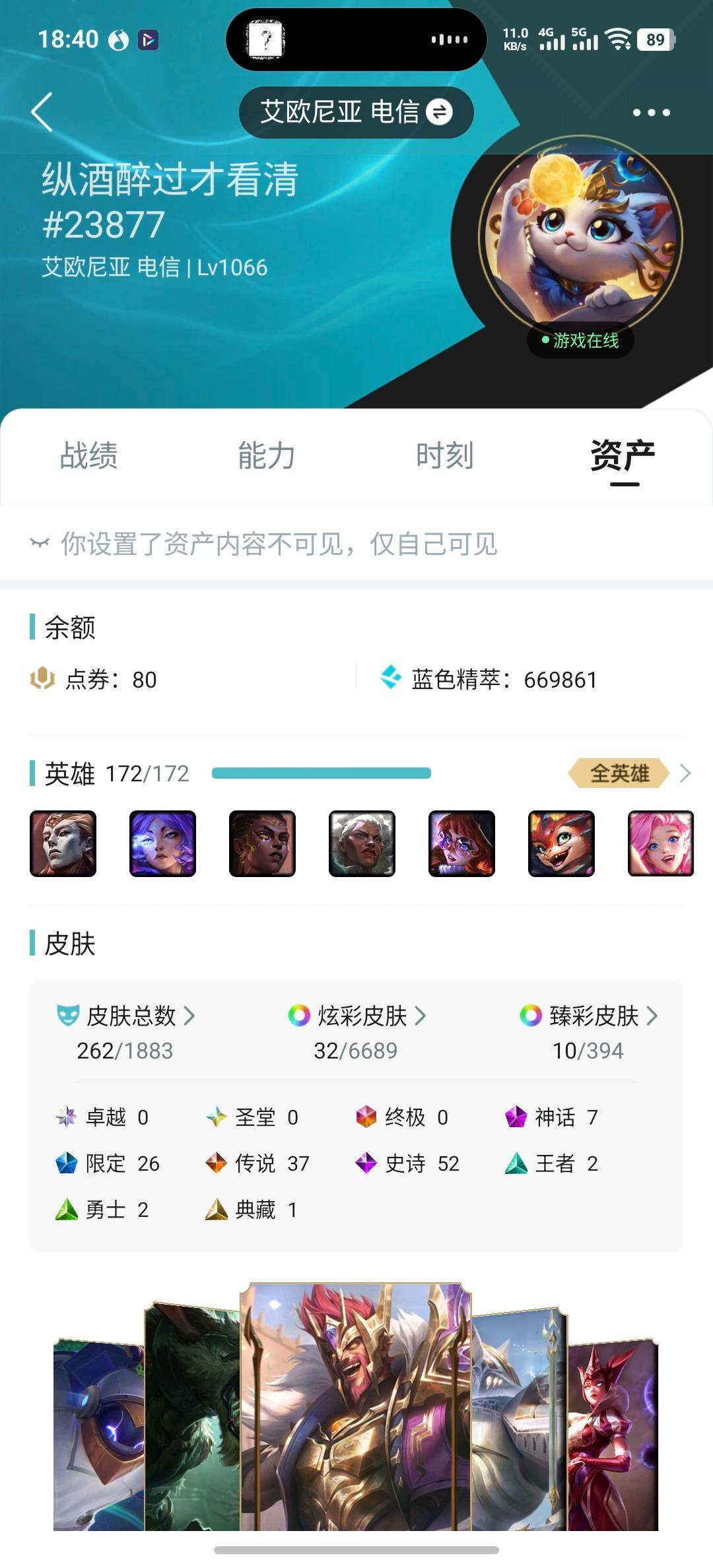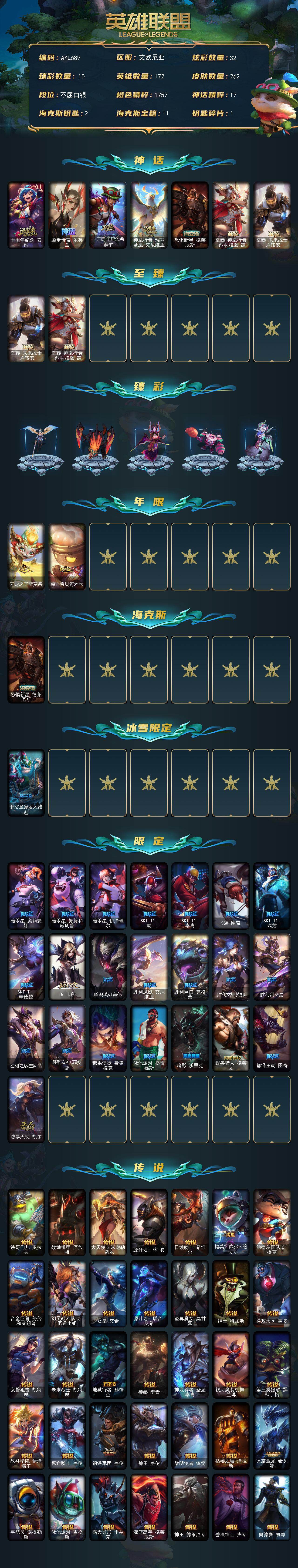 [16969074]【店主推荐捡漏号】白银段位-172英雄-262皮肤-32炫彩-0终极-7神话-26限定-37传说-52史诗