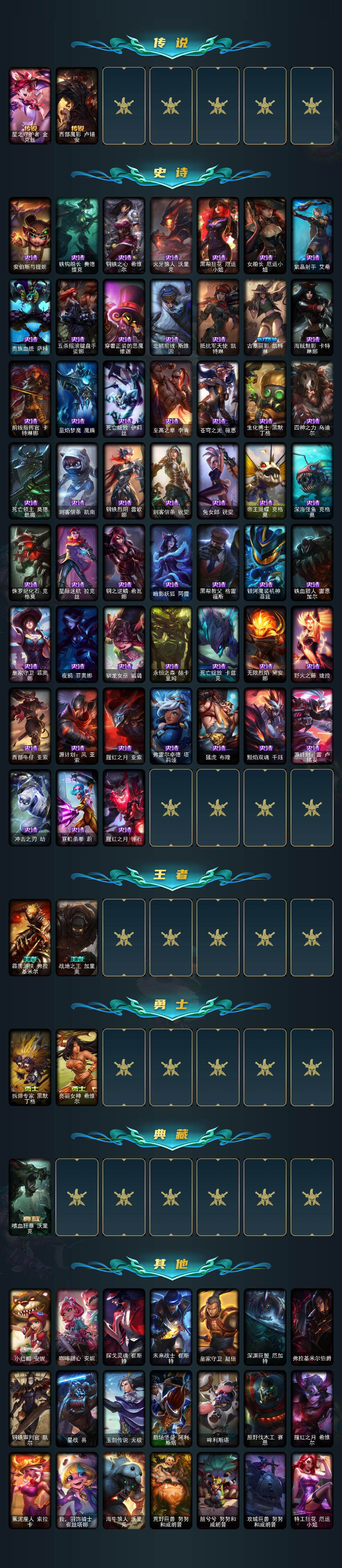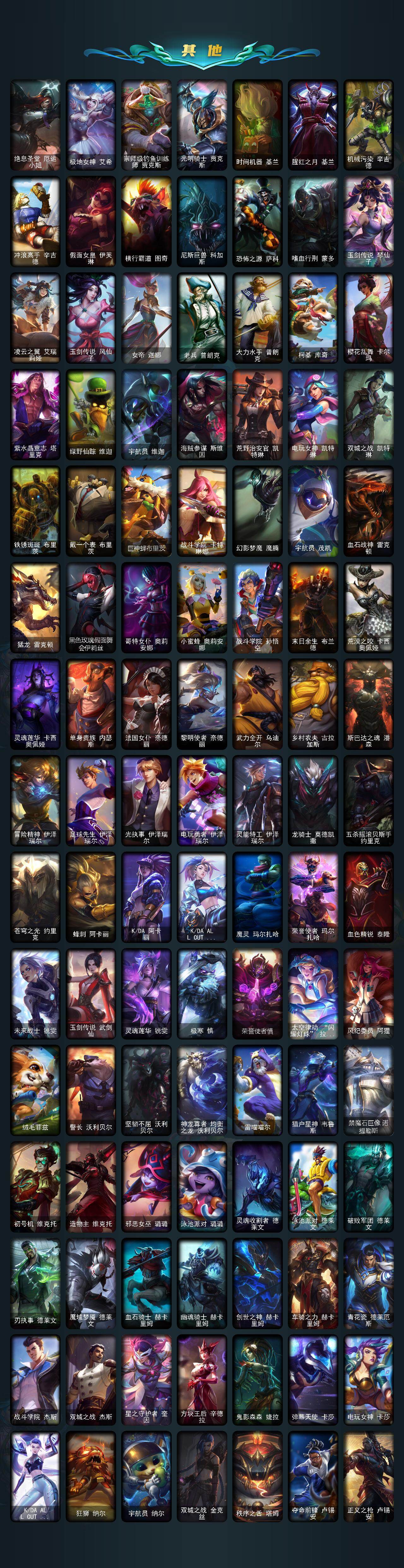 【传说皮肤】:铁哥们儿奥拉夫,战地机甲厄加特,大天使长米迦勒凯尔,源计划林易,日蚀骑士希维尔,提莫约德尔人的一大步,约德尔国队长提莫,合金巨兽努努和威朗普,幻灵战斗队长厄运小姐,女皇艾希,源计划联合艾希,至尊魔女莫甘娜,绅士科加斯,律政大亨蒙多,女警狙击凯特琳,未来战士凯特琳,地狱行者孙悟空,神拳李青,神龙尊者圣龙李青,银河魔装机神兰博,第三类接触黑默丁格,战斗学院伊泽瑞尔,死亡骑士盖伦,钢铁军团盖伦,神王盖伦,黎明使者锐雯,枯萎之壤泽拉斯,冰霜亚龙希瓦娜,宇航员诺提勒斯,泳池派对吉格斯,霸天异形卡兹克,灌篮高手德莱厄斯,神王德莱厄斯,蔷薇绅士杰斯,奥德赛凯隐,星之守护者金克丝,西部魔影卢锡安