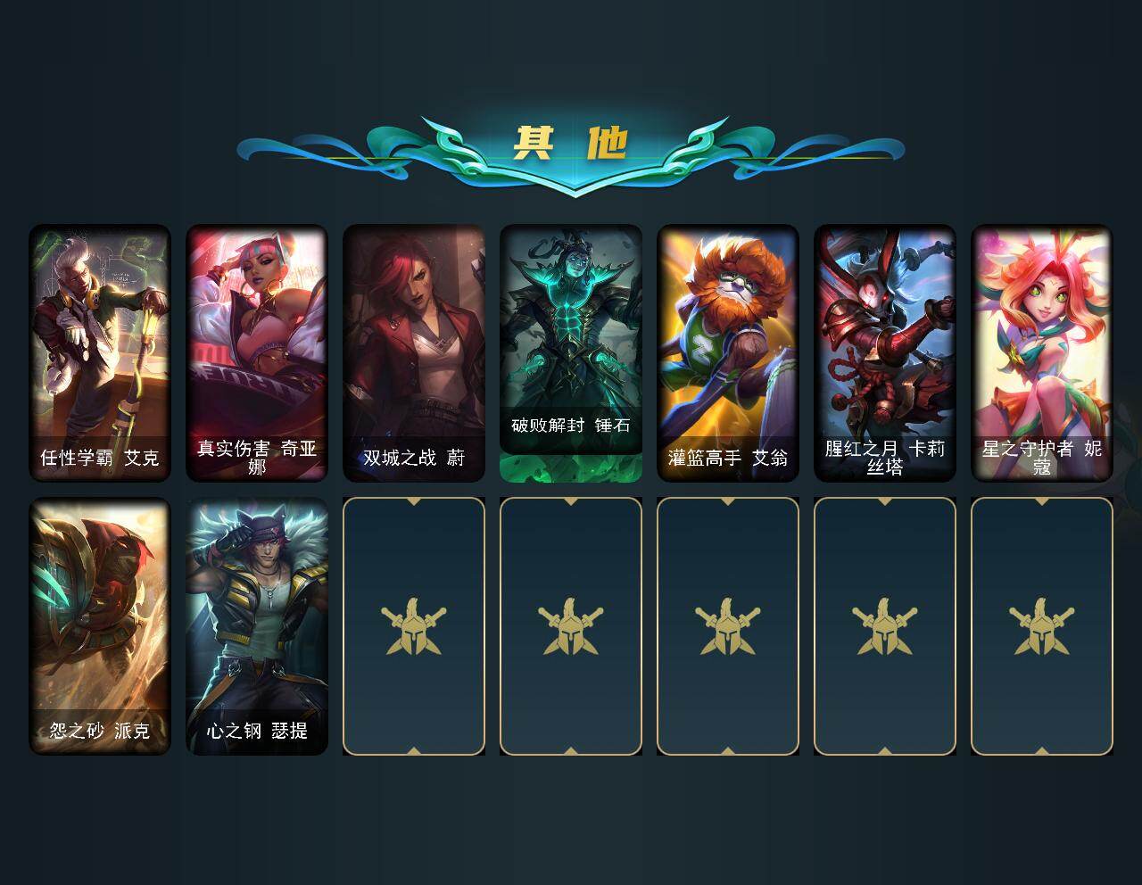 【史诗皮肤】:安伯斯与提妮,铁钩船长费德提克,钢铁之心希维尔,火牙狼人沃里克,黑帮狂花厄运小姐,女船长厄运小姐,紫晶射手艾希,贵族血统萨科,五杀摇滚键盘手娑娜,穿着正装的恶魔维迦,北领前线斯维因,抵抗军天使凯特琳,古墓丽影凯特琳,海贼魅影卡特琳娜,前线指挥官卡特琳娜,蓝焰梦魔魔腾,死亡绽放伊莉丝,至高之拳李青,苍穹之光薇恩,生化博士黑默丁格,四神之力乌迪尔,死亡领主莫德凯撒