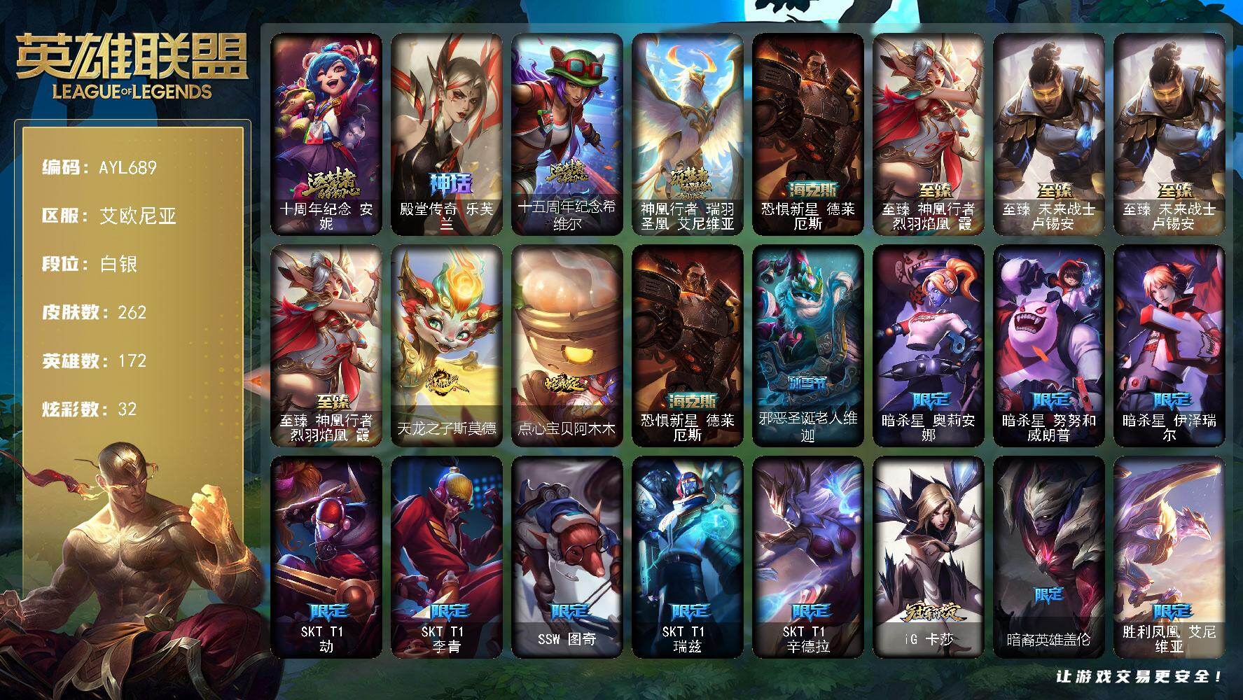 [16969074]【店主推荐捡漏号】白银段位-172英雄-262皮肤-32炫彩-0终极-7神话-26限定-37传说-52史诗 【神话皮肤】:十周年纪念安妮,殿堂传奇乐芙兰,十五周年纪念希维尔,神凰行者瑞羽圣凰艾尼维亚,恐惧新星德莱厄斯,至臻神凰行者烈羽焰凰霞,至臻未来战士卢锡安 【至臻皮肤】:至臻未来战士卢锡安,至臻神凰行者烈羽焰凰霞 【臻彩皮肤】:冠军之刃锐雯2016凯旋圣装,玉剑传说翼剑仙珠光,山海绘卷科加斯朱红,星之吞噬者莫甘娜热情之末,可爱可爱粉红红布里茨,殿堂传奇乐芙兰登神,星之守护者阿卡丽热情之光,魔女阿卡丽虚荣,净雪之月莫甘娜冬虹,霸天异形卡兹克黄金异端 【年限皮肤】:天龙之子斯莫德,点心宝贝阿木木 【海克斯皮肤】:恐惧新星德莱厄斯 【冰雪限定】:邪恶圣诞老人维迦 【限定皮肤】:暗杀星奥莉安娜,暗杀星努努和威朗普,暗杀星伊泽瑞尔,SKTT1劫,SKTT1李青,SSW图奇,SKTT1瑞兹,SKTT1辛德拉,iG卡莎,暗裔英雄盖伦,胜利凤凰艾尼维亚,胜利巨口克格莫,胜利女神娑娜,胜利剑圣易,胜利之运崔斯特,胜利女神菲奥娜,糖果使徒费德提克,泳池派对格雷福斯,暗影沃里克,野兽猎人德莱文,都铎王朝图奇,防暴天使凯尔 【传说皮肤】:铁哥们儿奥拉夫,战地机甲厄加特,大天使长米迦勒凯尔,源计划林易,日蚀骑士希维尔,提莫约德尔人的一大步,约德尔国队长提莫,合金巨兽努努和威朗普,幻灵战斗队长厄运小姐,女皇艾希,源计划联合艾希,至尊魔女莫甘娜,绅士科加斯,律政大亨蒙多,女警狙击凯特琳,未来战士凯特琳,地狱行者孙悟空,神拳李青,神龙尊者圣龙李青,银河魔装机神兰博,第三类接触黑默丁格,战斗学院伊泽瑞尔,死亡骑士盖伦,钢铁军团盖伦,神王盖伦,黎明使者锐雯,枯萎之壤泽拉斯,冰霜亚龙希瓦娜,宇航员诺提勒斯,泳池派对吉格斯,霸天异形卡兹克,灌篮高手德莱厄斯,神王德莱厄斯,蔷薇绅士杰斯,奥德赛凯隐,星之守护者金克丝,西部魔影卢锡安 【史诗皮肤】:安伯斯与提妮,铁钩船长费德提克,钢铁之心希维尔,火牙狼人沃里克,黑帮狂花厄运小姐,女船长厄运小姐,紫晶射手艾希,贵族血统萨科,五杀摇滚键盘手娑娜,穿着正装的恶魔维迦,北领前线斯维因,抵抗军天使凯特琳,古墓丽影凯特琳,海贼魅影卡特琳娜,前线指挥官卡特琳娜,蓝焰梦魔魔腾,死亡绽放伊莉丝,至高之拳李青,苍穹之光薇恩,生化博士黑默丁格,四神之力乌迪尔,死亡领主莫德凯撒
