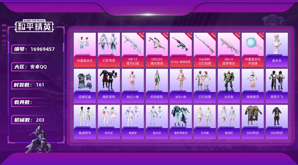[16969457]安卓 手Q-2粉装-6特效枪-0载具-4粉色飞行器-59638热力值-5王牌印记-161套装-203枪皮