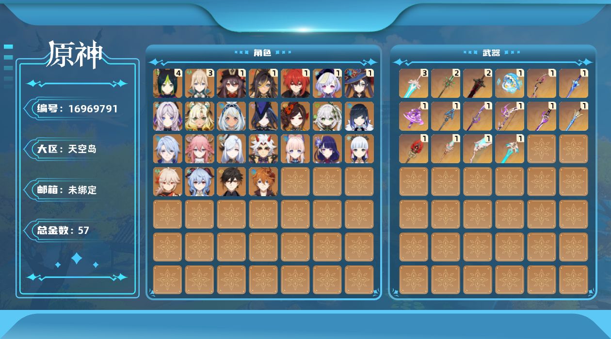 0命克洛琳德,0命千织,1命迪希雅,0命纳西妲,4命提纳里,0命夜兰,0命神里绫人,0命八重神子,0命申鹤,0命荒泷一斗,0命雷电将军,0命枫原万叶,0命神里绫华,0命钟离,1命胡桃,0命甘雨,0命达达利亚,0命珊瑚宫心海,1命七七,3命琴,1命莫娜,1命迪卢克,0命希诺宁,0命玛拉妮,0命茜特菈莉,精1最初的大魔术,精1波乱月白经津,精1神乐之真意,精1息灾,精1薙草之稻光,精1飞雷之弦振,精1雾切之回光,精1苍古自由之誓,精1护摩之杖,精2和璞鸢,精1天空之脊,精1天空之翼,精1天空之刃,精2狼的末路,精3天空之傲,精1冲浪时光