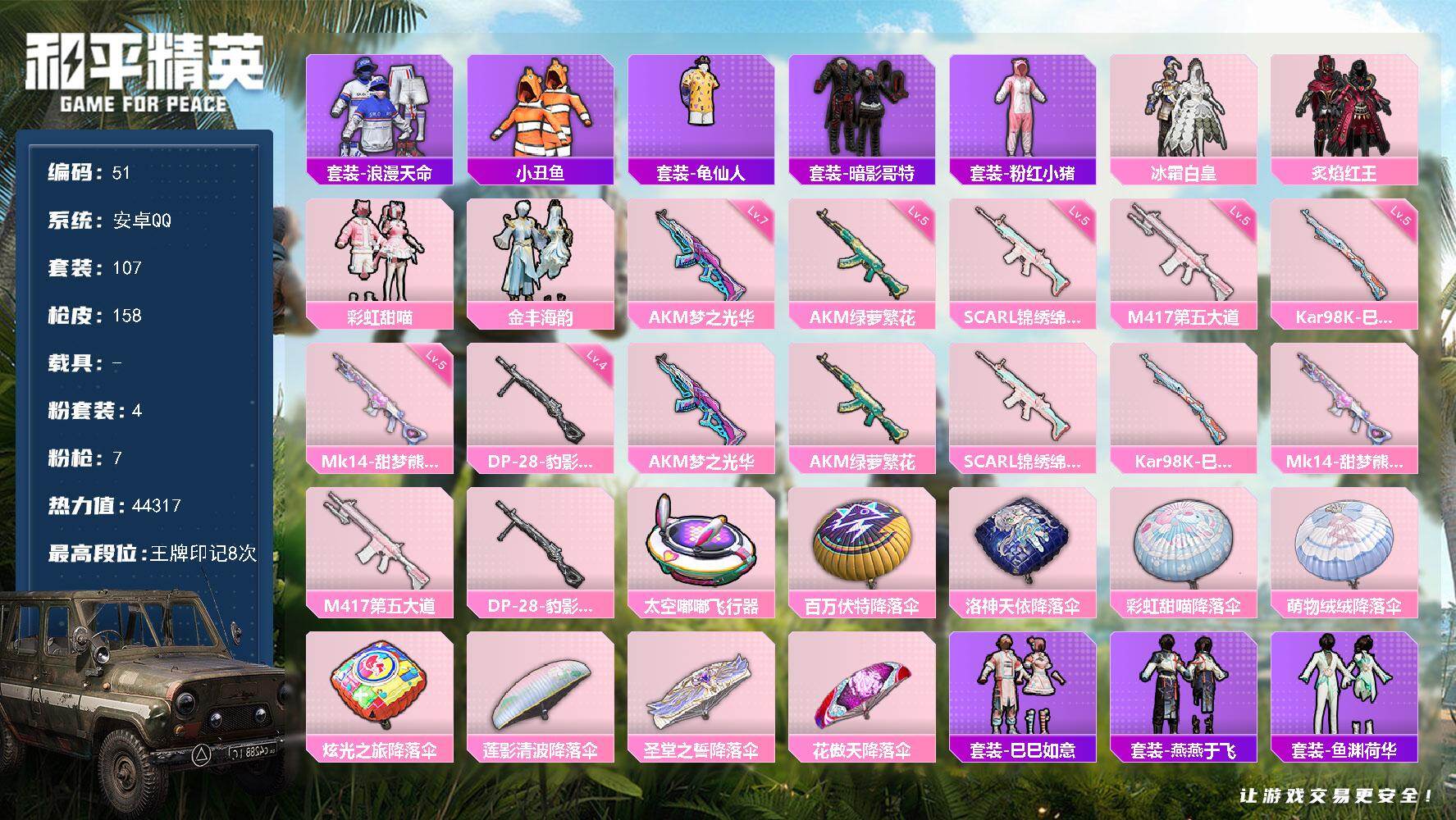 [16969843]安卓 手Q-4粉装-7特效枪-0载具-1粉色飞行器-44317热力值-8王牌印记-107套装-158枪皮
