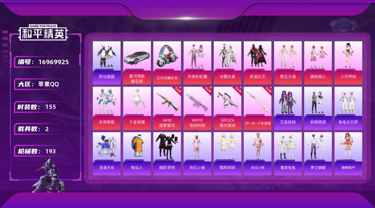 [16969925]苹果 手Q-8粉装-4特效枪-2载具-3粉色飞行器-65732热力值-6王牌印记-155套装-193枪皮