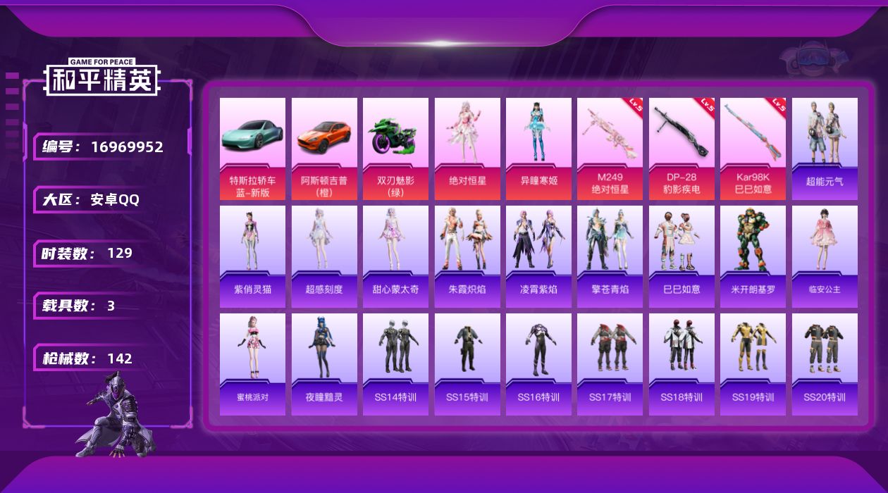 [16969952]安卓 手Q-2粉装-3特效枪-3载具-2粉色飞行器-47832热力值-3王牌印记-129套装-142枪皮 【粉色套装】:角色-绝对恒星,角色-异瞳寒姬 【粉色枪皮等级】:Kar98K-巳巳如意(五级),M249-绝对恒星(五级),DP-28-豹影疾电(五级) 【粉色载具】:特斯拉Roadster(水滴蓝),阿斯顿马丁DBX(橙),双人摩托-双刃魅影(绿) 【粉色枪皮】:Kar98K-巳巳如意,M249-绝对恒星,DP-28-豹影疾电 【粉色飞行器】:绝对恒星飞行器 【粉色降落伞】:绝对恒星降落伞,诡面斩降落伞,阿狸红降落伞,夏日绵绵冰降落伞,王牌四分卫降落伞,炙焰牛王降落伞,妙趣可丽降落伞,幻彩电音降落伞,极意拳锋降落伞,炫彩糖果降落伞 【稀有套装】:套装-巳巳如意,套装-超能元气,角色-超感刻度,角色-甜心蒙太奇,套装-雪国风尚,套装-炫彩糖果,角色-米开朗基罗,角色-临安公主,角色-蜜桃派对,角色-夜瞳黯灵,套装-朱霞炽焰,套装-凌霄紫焰,套装-擎苍青焰,角色-紫俏灵猫 【稀有枪皮】:AKM-夜灯,AKM-彩虹符号,AKM-破晓战魂,AKM-萌趣颜团子,AKM-虎虎生威,AKM-阿狸红,M16A4-甜心亚梦,M16A4-红色方程式,M16A4-蓝色火焰,SCAR-L-夏日绵绵冰,SCAR-L-夜灯,SCAR-L-流星咚咚,SCAR-L-炫彩节奏,SCAR-L-红色方程式,M416-红色方程式,M416-蓝色火焰,GROZA-治愈之星,AUG-天降萌叽,AUG-耀粉歌者,AUG-诡面斩,AUG-绝对恒星,QBZ-彩虹符号,M762-天降萌叽,M762-彩虹符号,M762-镭射皇者,AC-VAL-甜心亚梦,蜜獾-垂柳戏鸭,蜜獾-天降萌叽,ARX-凌霄紫焰,UZI-天降萌叽,UZI-影袭,UZI-红色方程式,UMP45-夜灯,UMP45-生命誓言,UMP45-蓝色火焰,Vector-治愈之星,Vector-生命誓言,汤姆逊-耀粉歌者,汤姆逊-诡面斩,汤姆逊-智耀战神,JS9-凌霄紫焰,P90-巳巳如意,Kar98K-炫彩节奏,Kar98K-红色方程式,Kar98K-星穹咏叹调,M24-治愈之星,VSS-彩虹符号,VSS-镭射皇者,Mini14-耀粉歌者,Mini14-阿狸红,Mk14-治愈之星,S686-彩虹符号,S686-红色方程式,S686-巳巳如意,S1897