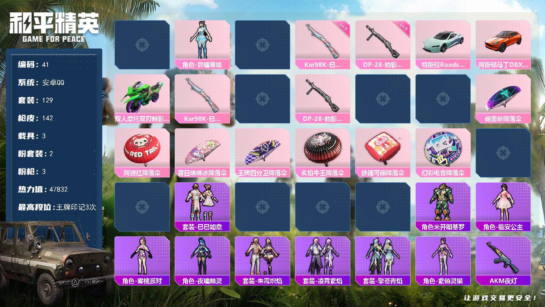 [16969952]安卓 手Q-2粉装-3特效枪-3载具-2粉色飞行器-47832热力值-3王牌印记-129套装-142枪皮
