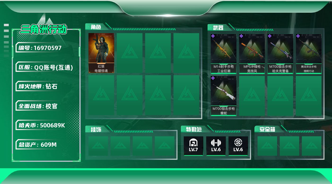 [16970597]【特价出售/店主推荐】 609m总资产-500689k哈伏币-60烽火等级-钻石-40战场等级-校官 【干员外观】:红狼-电锯惊魂 【近战皮肤】:近战-黑鹰 【史诗外观】:腾龙突击步枪-猎鳄行动,MP5冲锋枪-竞技风,M14射手步枪-工业狂潮,M700狙击步枪-蝮蛇,M700狙击步枪-哈夫克警备 【稀有外观】:K437突击步枪-巨兽,AKM突击步枪-肃杀,M7战斗步枪-前沿科技,腾龙突击步枪-冰天雪地,MP5冲锋枪-哈夫克卫队,Vector冲锋枪-先锋,UZI冲锋枪-亚特兰蒂斯,SMG-45-行动开启,SMG-45冲锋枪-幻影结构,SMG-45冲锋枪-精英联盟,勇士冲锋枪-精英联盟,勇士冲锋枪-冰天雪地,M1014霰弹枪-幻影结构,QJB201轻机枪-哈夫克卫队,Mini-14射手步枪-荣耀列队,SR-25射手步枪-开拓,SR9射手步枪-肃杀,G18-星链科技,G18-哈夫克航天 【普通外观】:UZI冲锋枪-蛇纹涂装,M249轻机枪-古铜,AKM突击步枪-噬菌体,M7战斗步枪-噬菌体,M4A1突击步枪-红色涂装,M4A1突击步枪-高雅黑,QBZ95-1突击步枪-海浪,QBZ95-1突击步枪-海色,QBZ191突击步枪-三角洲力量,K416突击步枪-几何迷彩,K416突击步枪-高雅黑,M16A4突击步枪-高雅黑,SG552突击步枪-浅蓝涂装,SG552突击步枪-海浪,G3战斗步枪-高雅黑,MP5冲锋枪-海色,MP5冲锋枪-黄蜂,Vector冲锋枪-几何迷彩,野牛冲锋枪-高雅黑,SR-3M紧凑突击步枪-三角洲力量,M1014霰弹枪-高雅黑,M249轻机枪-黄蜂,SVD狙击步枪-高雅黑,SR-25射手步枪-黄蜂,SV-98狙击步枪-红色涂装,沙漠之鹰-海浪,93R-三角洲力量 【载具外观】:突击直升机-英雄 【挂饰】:挂饰-窃风密探,挂饰-崩岩重炮*6,挂饰-暗行哨兵*8,挂饰-枪匠