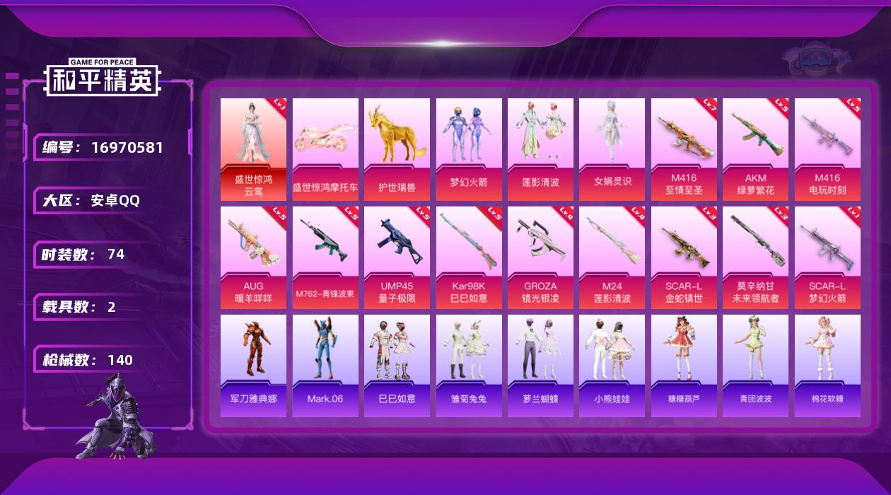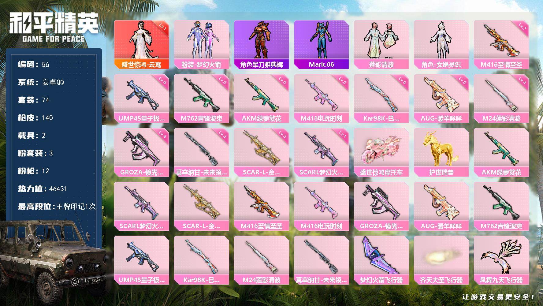 [16970581]安卓 手Q-1神装-3粉装-12特效枪-2载具-4粉色飞行器-46431热力值-1王牌印记-74套装-140枪皮
