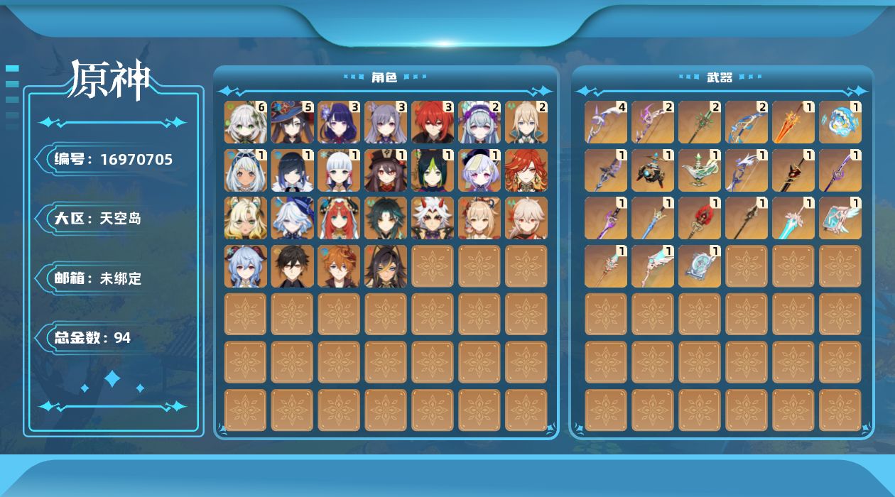 0命芙宁娜,0命迪希雅,满命纳西妲,0命妮露,1命提纳里,1命夜兰,0命荒泷一斗,3命雷电将军,0命枫原万叶,1命神里绫华,0命钟离,1命胡桃,0命甘雨,0命魈,0命宵宫,0命达达利亚,3命刻晴,1命七七,2命琴,5命莫娜,3命迪卢克,0命希诺宁,1命玛拉妮,0命玛薇卡,2命梦见月瑞希,0命丝柯克,0命菈乌玛,0命菲林斯,0命杜林,0命哥伦比娅,精1赦罪,精1金流监督,精1千夜浮梦,精1若水,精1赤角石溃杵,精2终末嗟叹之诗,精1薙草之稻光,精2飞雷之弦振,精1雾切之回光,精1苍古自由之誓,精1护摩之杖,精1四风原典,精2和璞鸢,精1天空之脊,精1贯虹之槊,精1天空之翼,精4阿莫斯之弓,精1天空之卷,精1天空之傲,精1冲浪时光,精1焚曜千阳,精1血染荒城