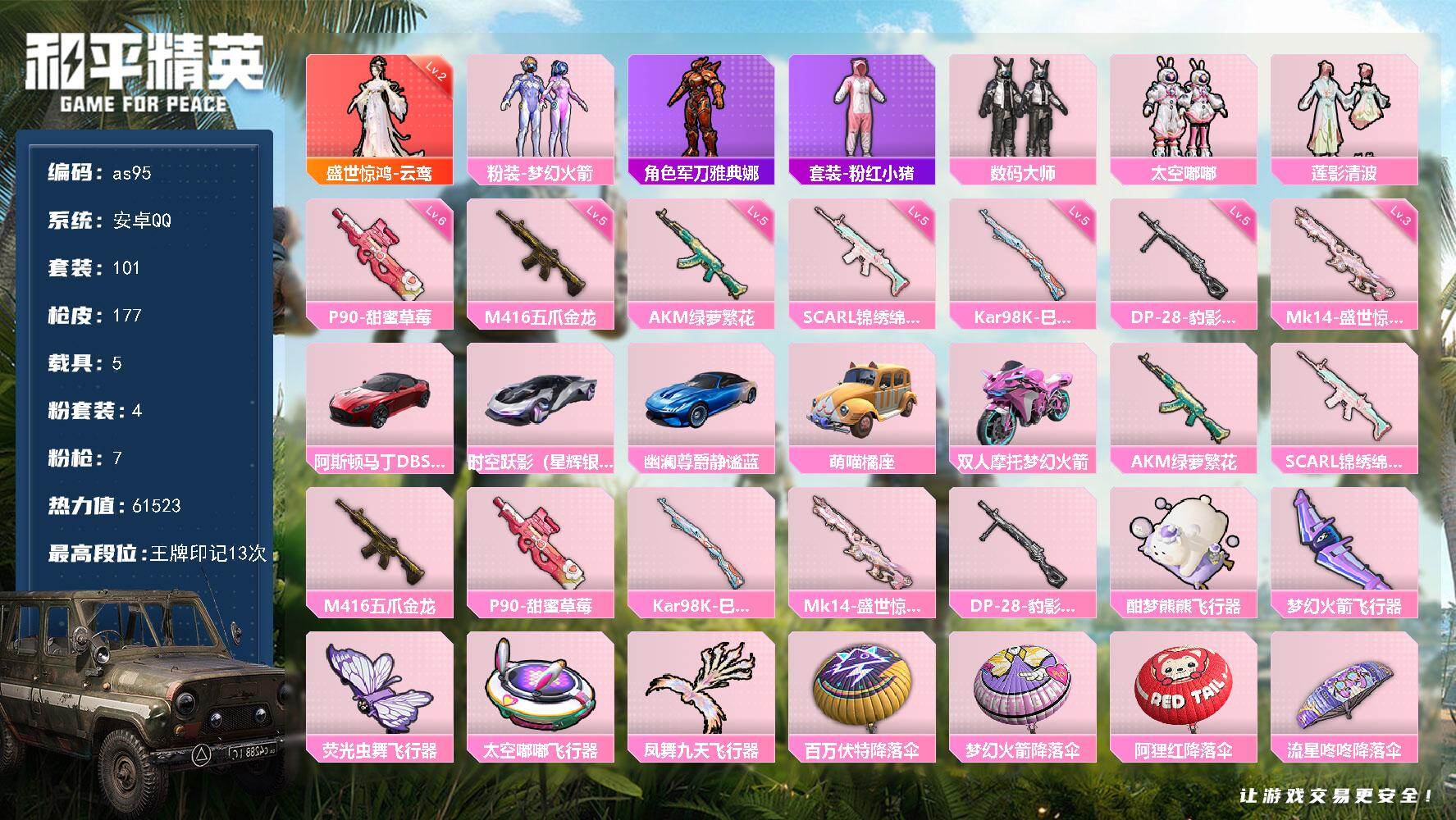 [16970942]安卓 手Q-1神装-4粉装-7特效枪-5载具-7粉色飞行器-61523热力值-13王牌印记-101套装-177枪皮