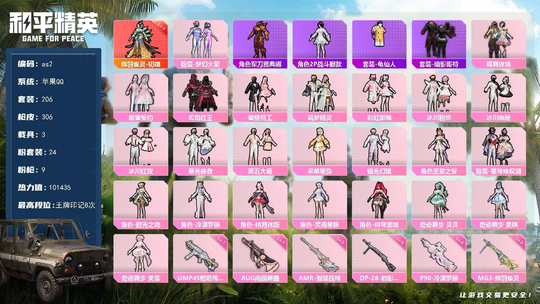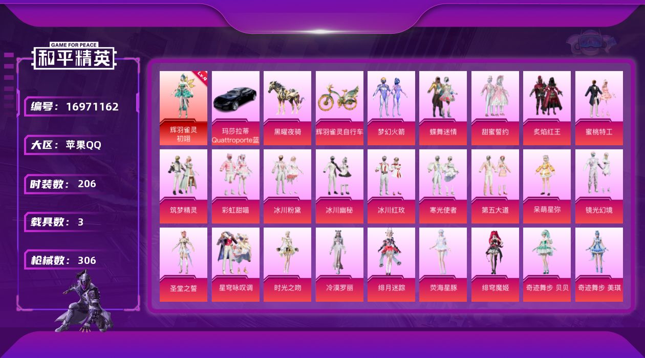 [16971162]苹果 手Q-1神装-24粉装-9特效枪-3载具-9粉色飞行器-101435热力值-8王牌印记-206套装-306枪皮