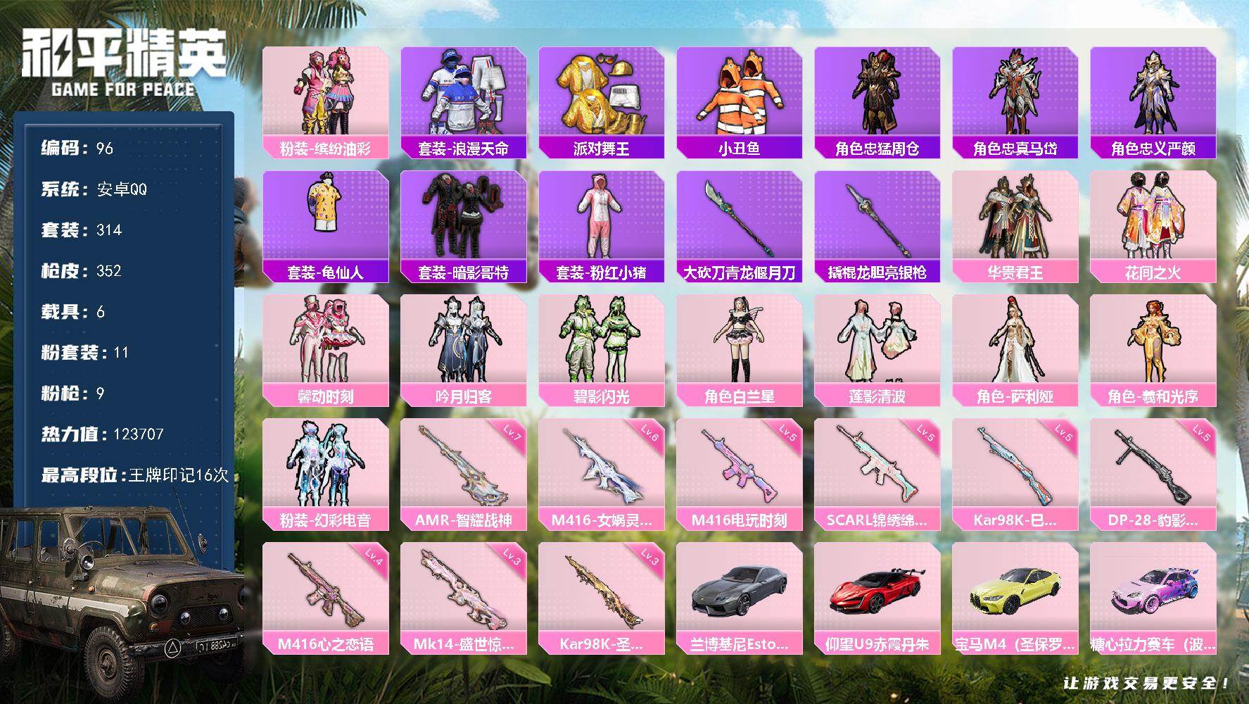 [16971272]安卓 手Q-11粉装-9特效枪-6载具-10粉色飞行器-123707热力值-16王牌印记-314套装-352枪皮