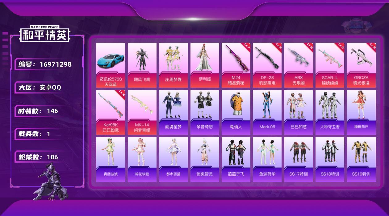 [16971298]安卓 手Q-3粉装-7特效枪-1载具-0粉色飞行器-53741热力值-11王牌印记-146套装-186枪皮 【热门品类】:套装-龟仙人,角色-Mark.06 【粉色套装】:粉装-飓风飞鹰,粉装-庄周梦蝶,角色-萨利娅 【粉色枪皮等级】:SCAR-L-锦绣绵绵(五级),GROZA-镜光银凌(五级),ARX-无垠阁(五级),Kar98K-巳巳如意(五级),M24-暗星紫秘(七级),DP-28-豹影疾电(五级) 【粉色载具】:迈凯伦570S(天际蓝) 【粉色枪皮】:SCAR-L-锦绣绵绵,GROZA-镜光银凌,ARX-无垠阁,Kar98K-巳巳如意,M24-暗星紫秘,Mk14-闲梦青缨,DP-28-豹影疾电 【粉色降落伞】:至尊龙雀降落伞,春暖花开降落伞,洛神天依降落伞,飒粉甜心降落伞,千金淑猫降落伞,鬼刀降落伞 【稀有套装】:套装-龟仙人,套装-巳巳如意,套装-雪国风尚,套装-火种守卫者,套装-糖糖葫芦,套装-青团波波,套装-棉花软糖,角色-都市丽猫,角色-俏兔智灵,套装-燕燕于飞,套装-鱼渊荷华,套装-画境星梦,套装-琴音绮想 【稀有枪皮】:AKM-彩虹符号,AKM-破晓战魂,AKM-虎虎生威,AKM-霓虹街区,AKM-龙的传人,M16A4-幻世战舞者,M16A4-千金淑猫,SCAR-L-夜灯,SCAR-L-玉兔迎春,SCAR-L-红色方程式,M416-糯团青竹,M416-红色方程式,M416-绯红前夜,M416-蓝色火焰,GROZA-异彩先驱,GROZA-恐龙拽拽,GROZA-懵萌河马,GROZA-荧海星豚,AUG-天降萌叽,AUG-耀粉歌者,QBZ-飞驰魅影,M762-彩虹符号,M762-瑞龙福将,Mk47-妙红点点,G36C-古战神甲,G36C-懵萌河马,G36C-星穹咏叹调,AC-VAL-天降萌叽,AC-VAL-快闪甜心,蜜獾-天降萌叽,ACE32-画境星梦,UZI-啾咪啾咪,UZI-天降萌叽,UZI-炫彩节奏,UZI-红色方程式,UMP45-夜灯,UMP45-涂山之恋,UMP45-生命誓言,Vector-焰鹰斗篷,Vector-彩虹符号,Vector-生命誓言,汤姆逊-天降萌叽,汤姆逊-异彩先驱,汤姆逊-炫彩节奏,野牛-天星战神,MP5K-异彩先驱,MP5K-画境星梦,P90-倾城蜜语,P90-快闪甜心,P90-飞驰魅影,P90-巳巳如意,Kar98K-彩