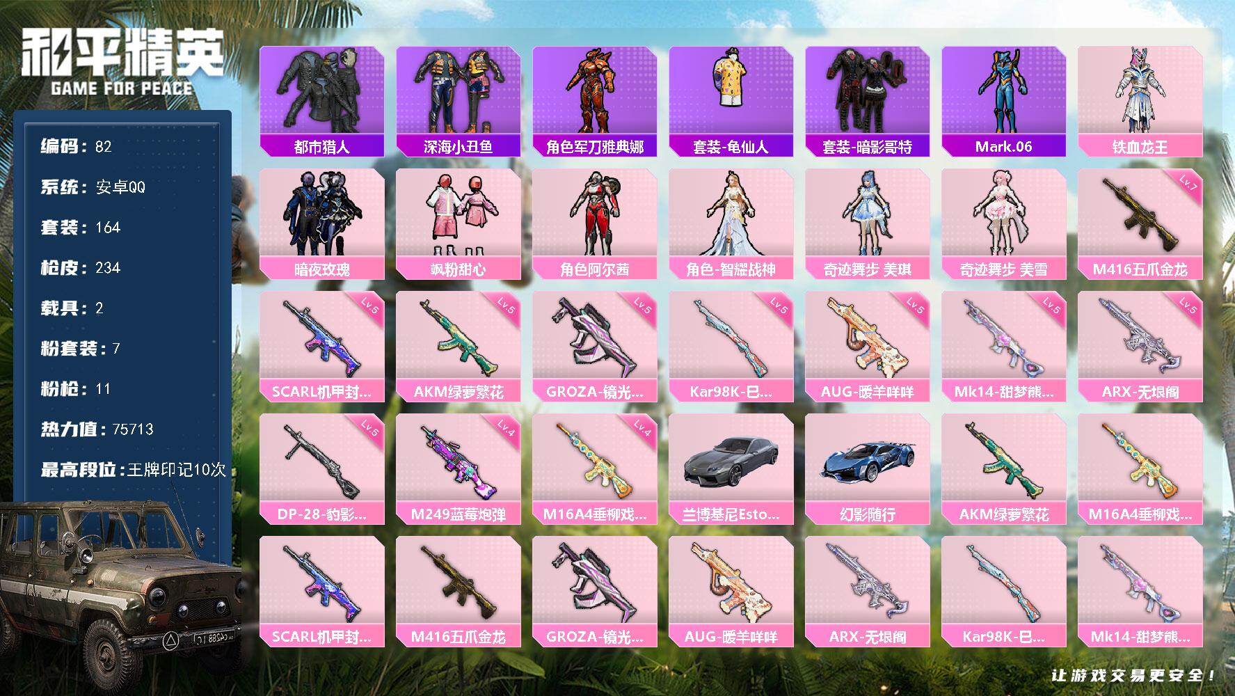 [16971338]安卓 手Q-7粉装-11特效枪-2载具-1粉色飞行器-75713热力值-10王牌印记-164套装-234枪皮