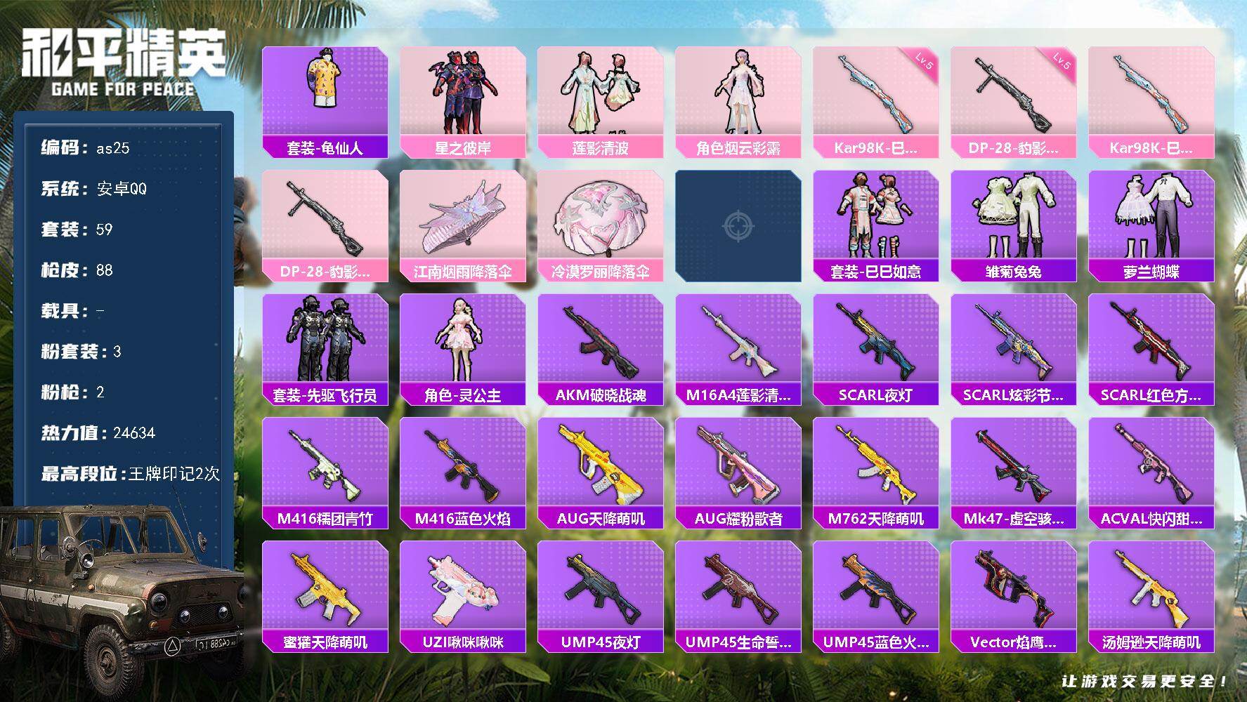 [16971730]安卓 手Q-3粉装-2特效枪-0载具-1粉色飞行器-24634热力值-2王牌印记-59套装-88枪皮