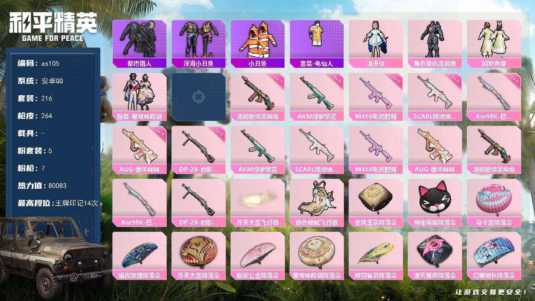 [16972266]安卓 手Q-5粉装-7特效枪-0载具-2粉色飞行器-80083热力值-14王牌印记-216套装-264枪皮 【热门品类】:套装-都市猎人,套装-深海小丑鱼,套装-小丑鱼,套装-龟仙人 【粉色套装】:角色-洛天依,角色-复仇流浪者,粉装-闲梦青缨,粉装-星穹咏叹调,角色-罪夜之冕 【粉色枪皮等级】:AKM-绿萝繁花(五级),SCAR-L-锦绣绵绵(五级),M416-电玩时刻(五级),AUG-暖羊咩咩(五级),汤姆逊-怪笑疯兔(七级),Kar98K-巳巳如意(五级),DP-28-豹影疾电(五级) 【粉色枪皮】:AKM-绿萝繁花,SCAR-L-锦绣绵绵,M416-电玩时刻,AUG-暖羊咩咩,汤姆逊-怪笑疯兔,Kar98K-巳巳如意,DP-28-豹影疾电 【粉色飞行器】:齐天大圣飞行器,绝色倾城飞行器 【粉色降落伞】:金风玉露降落伞,神秘黑猫降落伞,马卡龙降落伞,暗夜玫瑰降落伞,齐天大圣降落伞,临安公主降落伞,星穹咏叹调降落伞,辉羽雀灵降落伞,湮灭星辰降落伞,幻星舰长降落伞,幻彩电音降落伞,时光之吻降落伞,炫彩糖果降落伞 【稀有套装】:套装-龟仙人,套装-巳巳如意,套装-雪国风尚,套装-雏菊兔兔,套装-萝兰蝴蝶,套装-糖糖葫芦,套装-青团波波,套装-燕燕于飞,套装-鱼渊荷华,角色-风玲,套装-旋风灵鼠,套装-粉恋花,套装-紫幽梦,套装-蓝冰羽,套装-星影赞美诗,套装-虚空漩涡,套装-霓虹热舞,套装-云朵鹅,套装-雪绒豹,套装-诡诞巡游,角色-玫纹锢梦,角色-夜瞳黯灵,套装-朱霞炽焰,套装-凌霄紫焰 【稀有枪皮】:AKM-夜灯,AKM-灼热熔岩,AKM-生命誓言,AKM-破晓战魂,AKM-缤纷海域,AKM-萌趣颜团子,AKM-虎虎生威,AKM-霓虹街区,AKM-龙的传人,M16A4-幻世战舞者,M16A4-生命誓言,M16A4-红色方程式,M16A4-蓝色火焰,SCAR-L-炫彩节奏,SCAR-L-玉兔迎春,SCAR-L-红色方程式,M416-夜灯,M416-滑板小狐,M416-糯团青竹,M416-红色方程式,M416-绯红前夜,M416-蓝色火焰,AUG-天降萌叽,AUG-耀粉歌者,AUG-青春冒险家,AUG-绝对恒星,QBZ-原初圣火,QBZ-诡娃娃,M762-天降萌叽,M762-牛气冲天,M762-诡娃娃,M762-镭射皇者,M762-云朵鹅,Mk47-青春冒险家,M