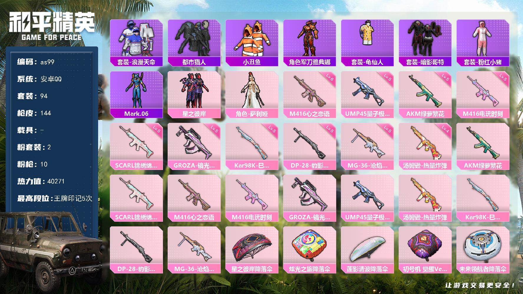 [16972311]安卓 手Q-2粉装-10特效枪-0载具-1粉色飞行器-40271热力值-5王牌印记-94套装-144枪皮