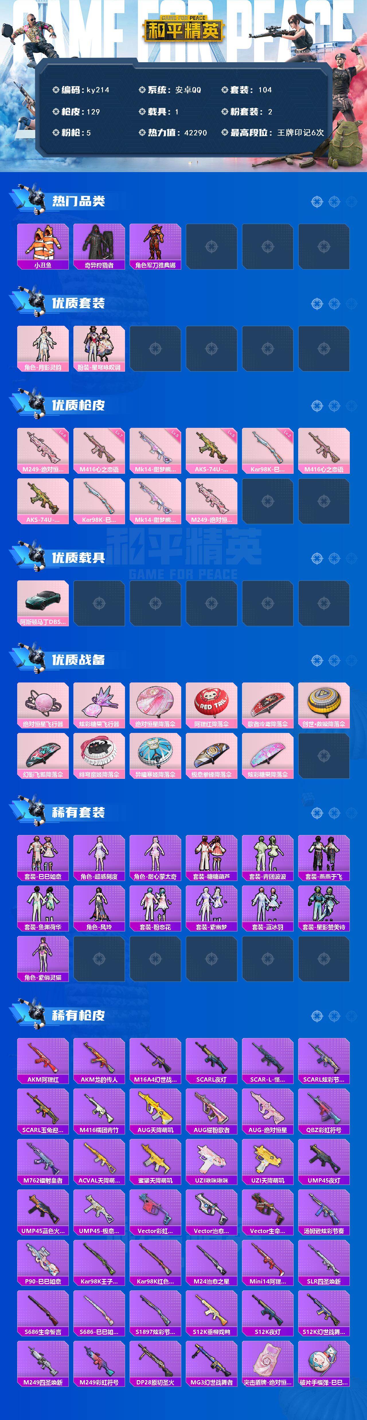 [16972580]安卓 手Q-2粉装-5特效枪-1载具-2粉色飞行器-42290热力值-6王牌印记-104套装-129枪皮 【热门品类】:套装-小丑鱼,套装-奇异狩猎者,角色-军刀雅典娜 【粉色套装】:角色-月影灵韵,粉装-星穹咏叹调 【粉色枪皮等级】:M416-心之恋语(七级),AKS-74U-森灵之息(五级),Kar98K-巳巳如意(二级),Mk14-甜梦熊击(五级),M249-绝对恒星(六级) 【粉色载具】:阿斯顿马丁DBS(绿) 【粉色枪皮】:M416-心之恋语,AKS-74U-森灵之息,Kar98K-巳巳如意,Mk14-甜梦熊击,M249-绝对恒星 【粉色飞行器】:绝对恒星飞行器,炫彩糖果飞行器 【粉色降落伞】:绝对恒星降落伞,阿狸红降落伞,歌者泠鸢降落伞,创世·救赎降落伞,幻影飞狐降落伞,绯穹魔姬降落伞,异瞳寒姬降落伞,极意拳锋降落伞,炫彩糖果降落伞 【稀有套装】:套装-巳巳如意,角色-超感刻度,角色-甜心蒙太奇,套装-雪国风尚,套装-炫彩糖果,套装-糖糖葫芦,套装-青团波波,套装-燕燕于飞,套装-鱼渊荷华,角色-风玲,套装-粉恋花,套装-紫幽梦,套装-蓝冰羽,套装-星影赞美诗,角色-紫俏灵猫 【稀有枪皮】:AUG-冰晶雪宝,AKM-阿狸红,AKM-龙的传人,M16A4-幻世战舞者,SCAR-L-夜灯,SCAR-L-怪兽之王,SCAR-L-炫彩节奏,SCAR-L-玉兔迎春,M416-糯团青竹,AUG-天降萌叽,AUG-耀粉歌者,AUG-绝对恒星,QBZ-彩虹符号,M762-镭射皇者,AC-VAL-天降萌叽,蜜獾-天降萌叽,UZI-啾咪啾咪,UZI-天降萌叽,UMP45-夜灯,UMP45-蓝色火焰,UMP45-极意拳锋,Vector-彩虹符号,Vector-治愈之星,Vector-生命誓言,汤姆逊-炫彩节奏,P90-巳巳如意,Kar98K-王子的夏天,Kar98K-红色方程式,M24-治愈之星,Mini14-阿狸红,SLR-四圣焕新,S686-生命誓言,S686-巳巳如意,S1897-炫彩节奏,S12K-垂柳戏鸭,S12K-夜灯,S12K-幻世战舞者,M249-四圣焕新,M249-彩虹符号,DP-28-原初圣火,MG3-幻世战舞者,突击盾牌-绝对恒星,破片手榴弹-巳巳如意 【其他套装】:套装-SS20特训,套装-SS21特训,套装-SS22特训,套装-SS26特训,套装-