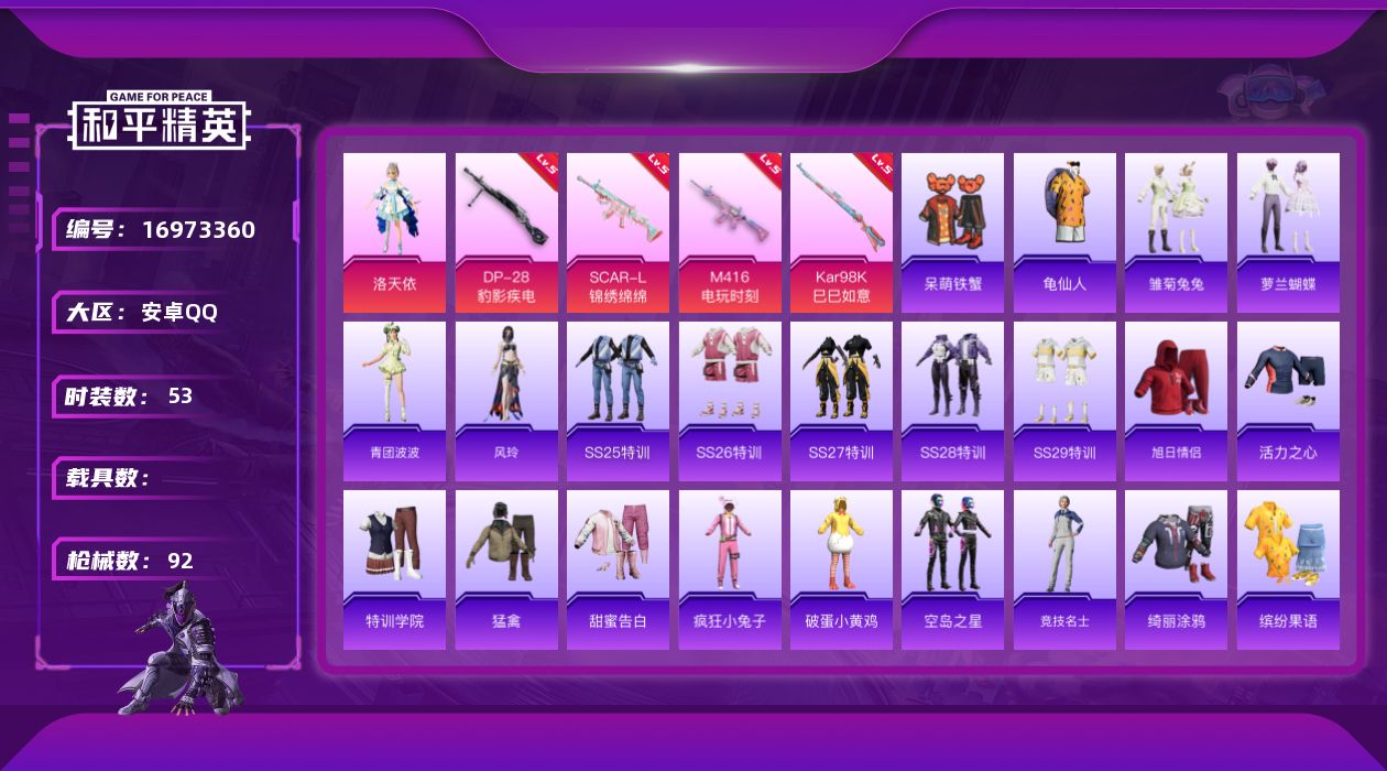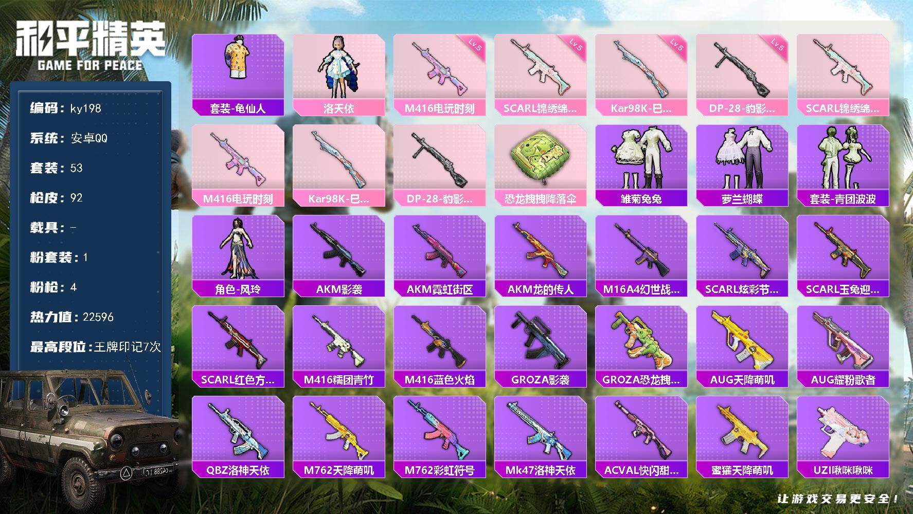 [16973360]安卓 手Q-1粉装-4特效枪-0载具-0粉色飞行器-22596热力值-7王牌印记-53套装-92枪皮