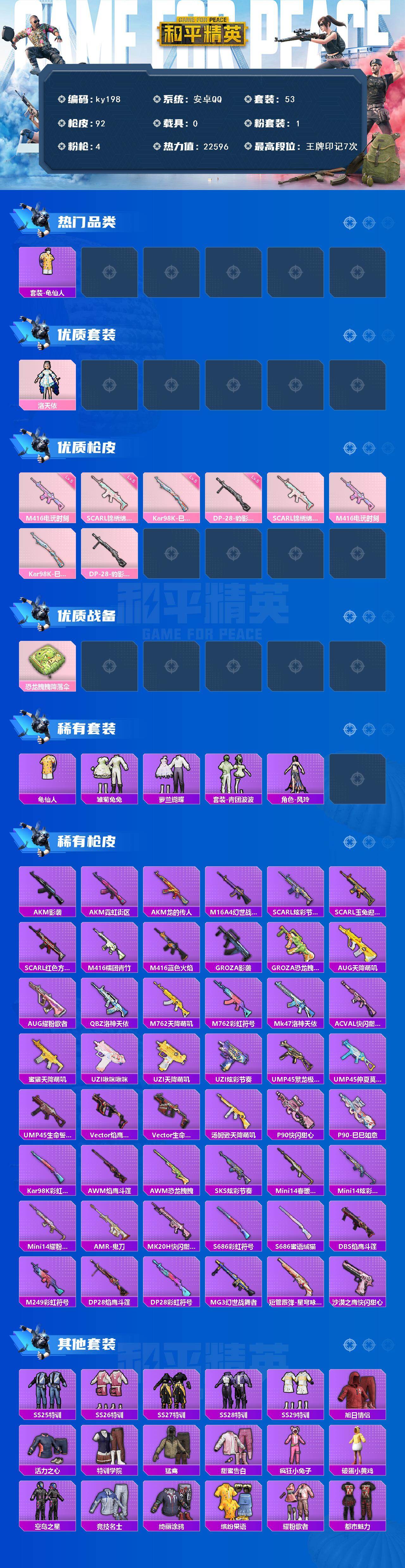 [16973360]安卓 手Q-1粉装-4特效枪-0载具-0粉色飞行器-22596热力值-7王牌印记-53套装-92枪皮 【热门品类】:套装-龟仙人 【粉色套装】:角色-洛天依 【粉色枪皮等级】:SCAR-L-锦绣绵绵(五级),M416-电玩时刻(五级),Kar98K-巳巳如意(五级),DP-28-豹影疾电(五级) 【粉色枪皮】:SCAR-L-锦绣绵绵,M416-电玩时刻,Kar98K-巳巳如意,DP-28-豹影疾电 【粉色降落伞】:恐龙拽拽降落伞 【稀有套装】:套装-龟仙人,套装-雏菊兔兔,套装-萝兰蝴蝶,套装-青团波波,角色-风玲 【稀有枪皮】:AKM-影袭,AKM-霓虹街区,AKM-龙的传人,M16A4-幻世战舞者,SCAR-L-炫彩节奏,SCAR-L-玉兔迎春,SCAR-L-红色方程式,M416-糯团青竹,M416-蓝色火焰,GROZA-影袭,GROZA-恐龙拽拽,AUG-天降萌叽,AUG-耀粉歌者,QBZ-洛神天依,M762-天降萌叽,M762-彩虹符号,Mk47-洛神天依,AC-VAL-快闪甜心,蜜獾-天降萌叽,UZI-啾咪啾咪,UZI-天降萌叽,UZI-炫彩节奏,UMP45-繁龙极客,UMP45-仲夏莫吉托,UMP45-生命誓言,Vector-焰鹰斗篷,Vector-生命誓言,汤姆逊-天降萌叽,P90-快闪甜心,P90-巳巳如意,Kar98K-彩虹符号,AWM-焰鹰斗篷,AWM-恐龙拽拽,SKS-炫彩节奏,Mini14-春暖花开,Mini14-炫彩节奏,Mini14-耀粉歌者,AMR-鬼刀,MK20-H-快闪甜心,S686-蜜语绒猫,S686-彩虹符号,DBS-焰鹰斗篷,M249-彩虹符号,DP-28-焰鹰斗篷,DP-28-彩虹符号,MG3-幻世战舞者,短管霰弹-星穹咏叹调,沙漠之鹰-快闪甜心 【其他套装】:套装-SS25特训,套装-SS26特训,套装-SS27特训,套装-SS28特训,套装-SS29特训,套装-旭日情侣,套装-活力之心,套装-特训学院,套装-猛禽,套装-甜蜜告白,套装-疯狂小兔子,套装-破蛋小黄鸡,套装-空岛之星,套装-竞技名士,套装-绮丽涂鸦,套装-缤纷果语,套装-耀粉歌者,套装-都市魅力,套装-长空猛禽,套装-霓虹街区,套装-青玉碎影,套装-魅力单车,套装-黑色伏地魔,套装-龙的传人,套装-龟仙人,套装-冰冻风暴,套装-呆萌铁蟹,套装-豚鼠丹丹,套