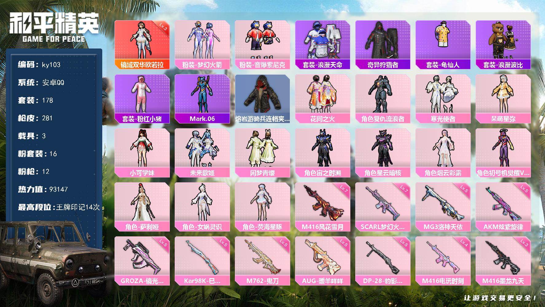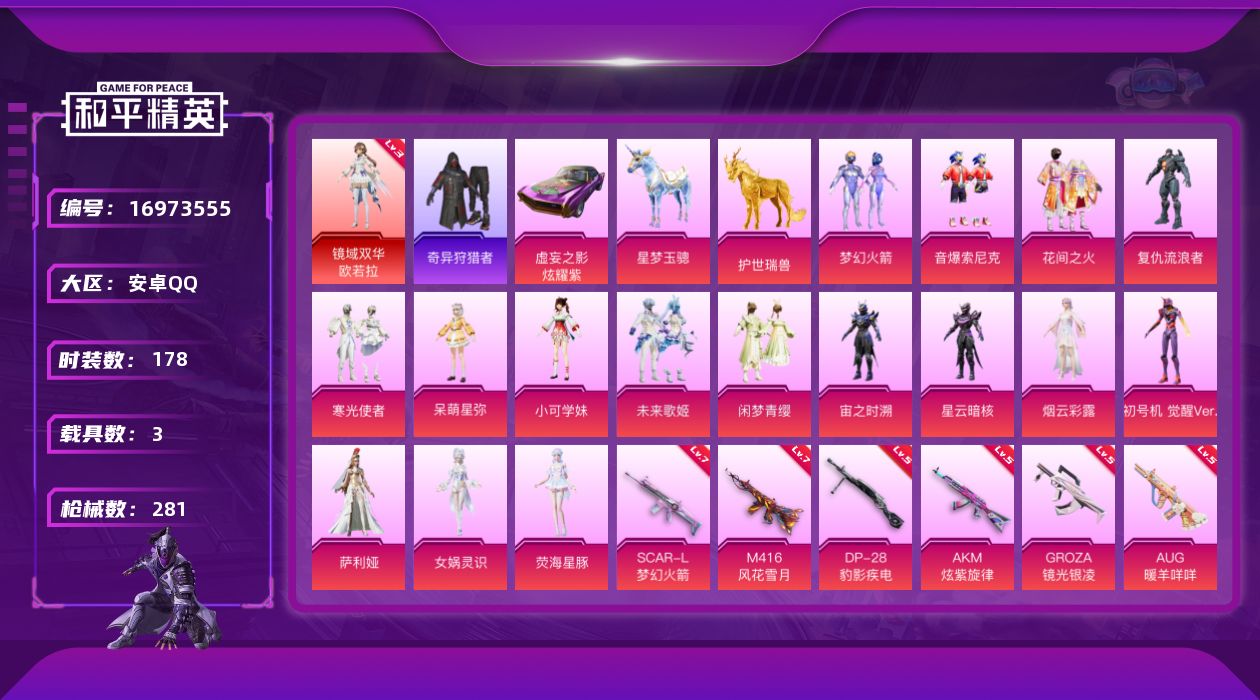 [16973555]安卓 手Q-1神装-16粉装-12特效枪-3载具-7粉色飞行器-93147热力值-14王牌印记-178套装-281枪皮