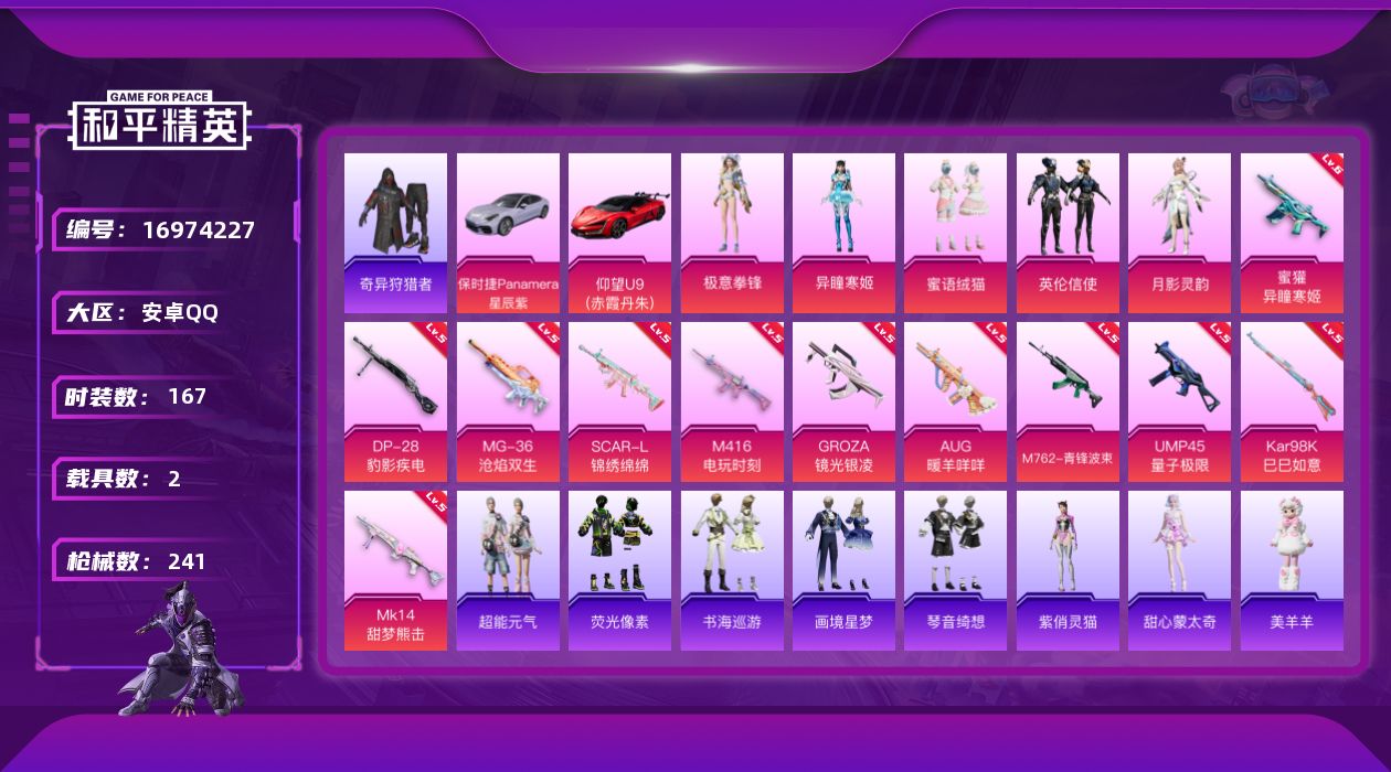 [16974227]安卓 手Q-5粉装-12特效枪-2载具-4粉色飞行器-74651热力值-11王牌印记-167套装-241枪皮