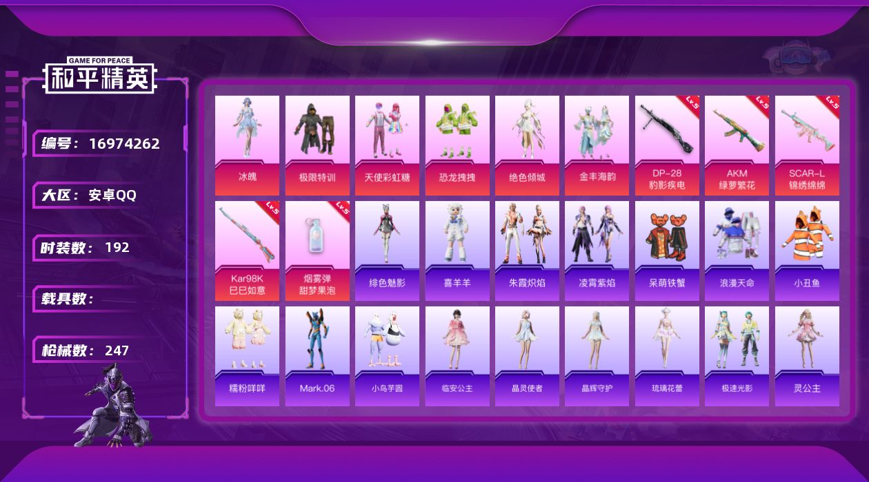 [16974262]安卓 手Q-6粉装-5特效枪-0载具-6粉色飞行器-74782热力值-16王牌印记-192套装-247枪皮