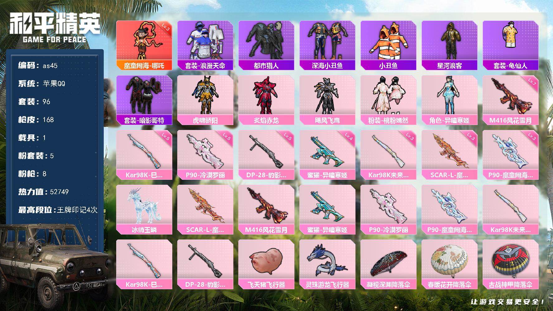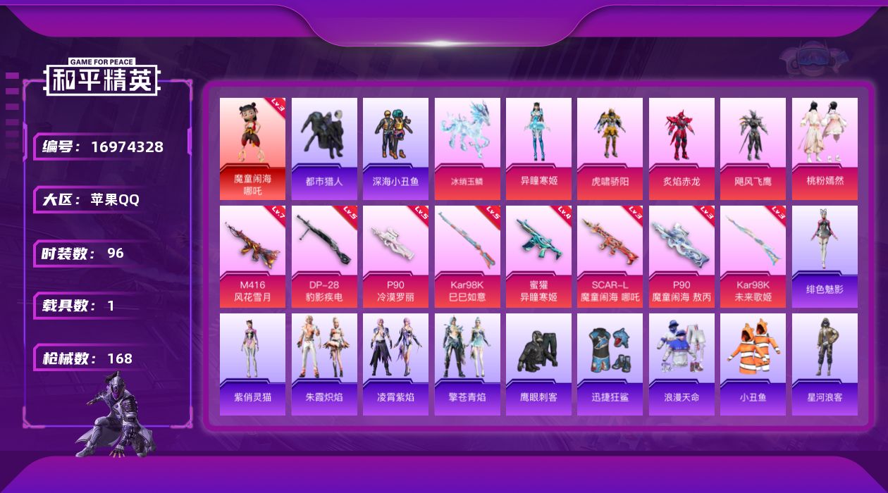 [16974328]苹果 手Q-1神装-5粉装-8特效枪-1载具-3粉色飞行器-52749热力值-4王牌印记-96套装-168枪皮