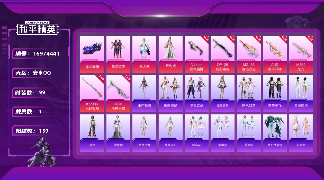 [16974441]安卓 手Q-3粉装-8特效枪-1载具-1粉色飞行器-45186热力值-10王牌印记-99套装-159枪皮 【粉色套装】:粉装-星之彼岸,角色-洛天依,角色-萨利娅 【粉色枪皮等级】:AUG-暖羊咩咩(五级),M762-鬼刀(五级),Vector-绯穹魔姬(六级),AKS-74U-森灵之息(五级),Kar98K-巳巳如意(五级),DP-28-豹影疾电(五级),MG3-洛神天依(五级),MG-36-沧焰双生(五级) 【粉色载具】:海龙奔腾 【粉色枪皮】:AUG-暖羊咩咩,M762-鬼刀,Vector-绯穹魔姬,AKS-74U-森灵之息,Kar98K-巳巳如意,DP-28-豹影疾电,MG3-洛神天依,MG-36-沧焰双生 【粉色降落伞】:洛神天依降落伞,第五大道降落伞,鬼刀降落伞,异瞳寒姬降落伞,炫彩糖果降落伞 【稀有套装】:套装-摩登天骄,套装-巳巳如意,套装-雪国风尚,套装-炫彩糖果,套装-燕燕于飞,套装-鱼渊荷华,角色-风玲,角色-海琴烟,套装-晶灵使者,套装-晶辉守护,套装-粉恋花,套装-紫幽梦,套装-蓝冰羽,套装-星影赞美诗,套装-彩虹兔,套装-云朵鹅,套装-雪绒豹,套装-朱霞炽焰,套装-凌霄紫焰,角色-绯色魅影 【稀有枪皮】:M79短管榴弹-钛晶裂爪,AUG-冰晶雪宝,AKM-彩虹符号,AKM-灼热熔岩,AKM-破晓战魂,M16A4-幻世战舞者,SCAR-L-夜灯,SCAR-L-玉兔迎春,SCAR-L-红色方程式,M416-红色方程式,M416-蓝色火焰,GROZA-彩虹符号,GROZA-恐龙拽拽,GROZA-田园牧歌,GROZA-荧海星豚,GROZA-晶梦幻蝶,AUG-耀粉歌者,M762-天降萌叽,M762-彩虹符号,M762-云朵鹅,M762-登顶巅峰,AC-VAL-天降萌叽,蜜獾-天降萌叽,ARX-凌霄紫焰,UZI-炫彩节奏,UZI-红色方程式,UZI-魔药课室,UMP45-夜灯,UMP45-炫光之旅,UMP45-蓝色火焰,Vector-田园牧歌,汤姆逊-暗夜鎏金,汤姆逊-炫彩节奏,汤姆逊-智耀战神,AKS-74U-鬼刀,JS9-凌霄紫焰,P90-巳巳如意,M24-炫彩节奏,SKS-炫彩节奏,VSS-田园牧歌,Win94-晶梦幻蝶,AMR-鬼刀,MK20-H-启明星,SVD-云朵鹅,S686-生命誓言,S686-时光之誓,S686-巳巳如意,S1897