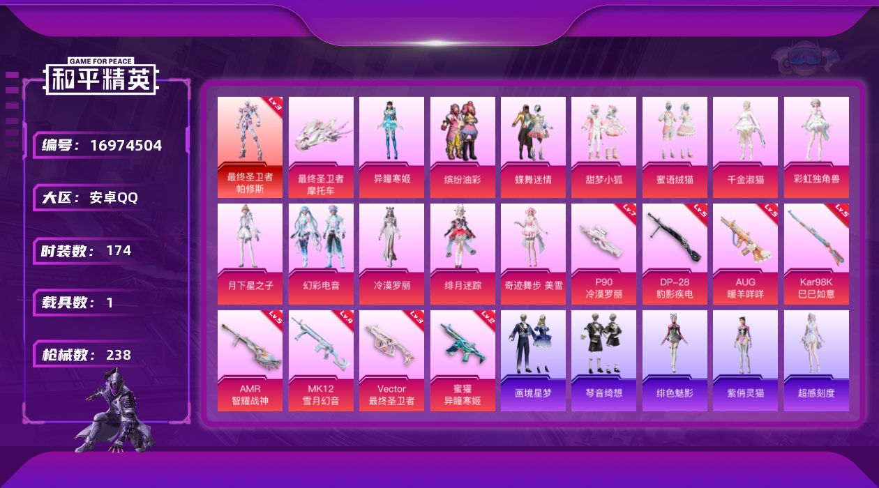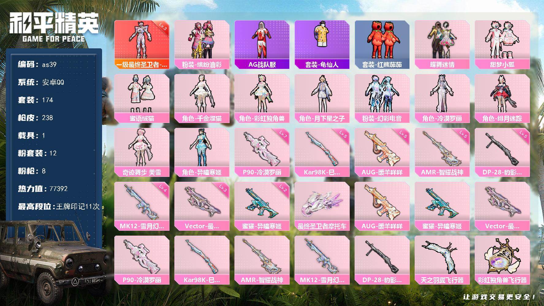 [16974504]安卓 手Q-1神装-12粉装-8特效枪-1载具-5粉色飞行器-77392热力值-11王牌印记-174套装-238枪皮