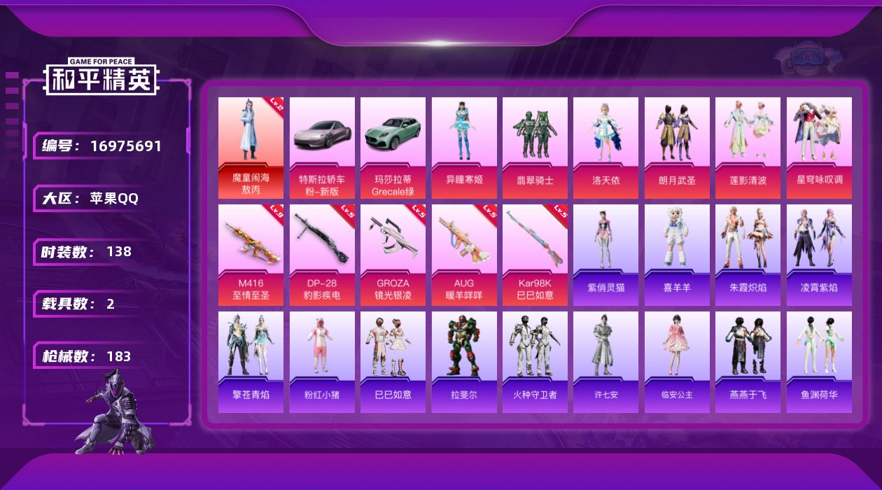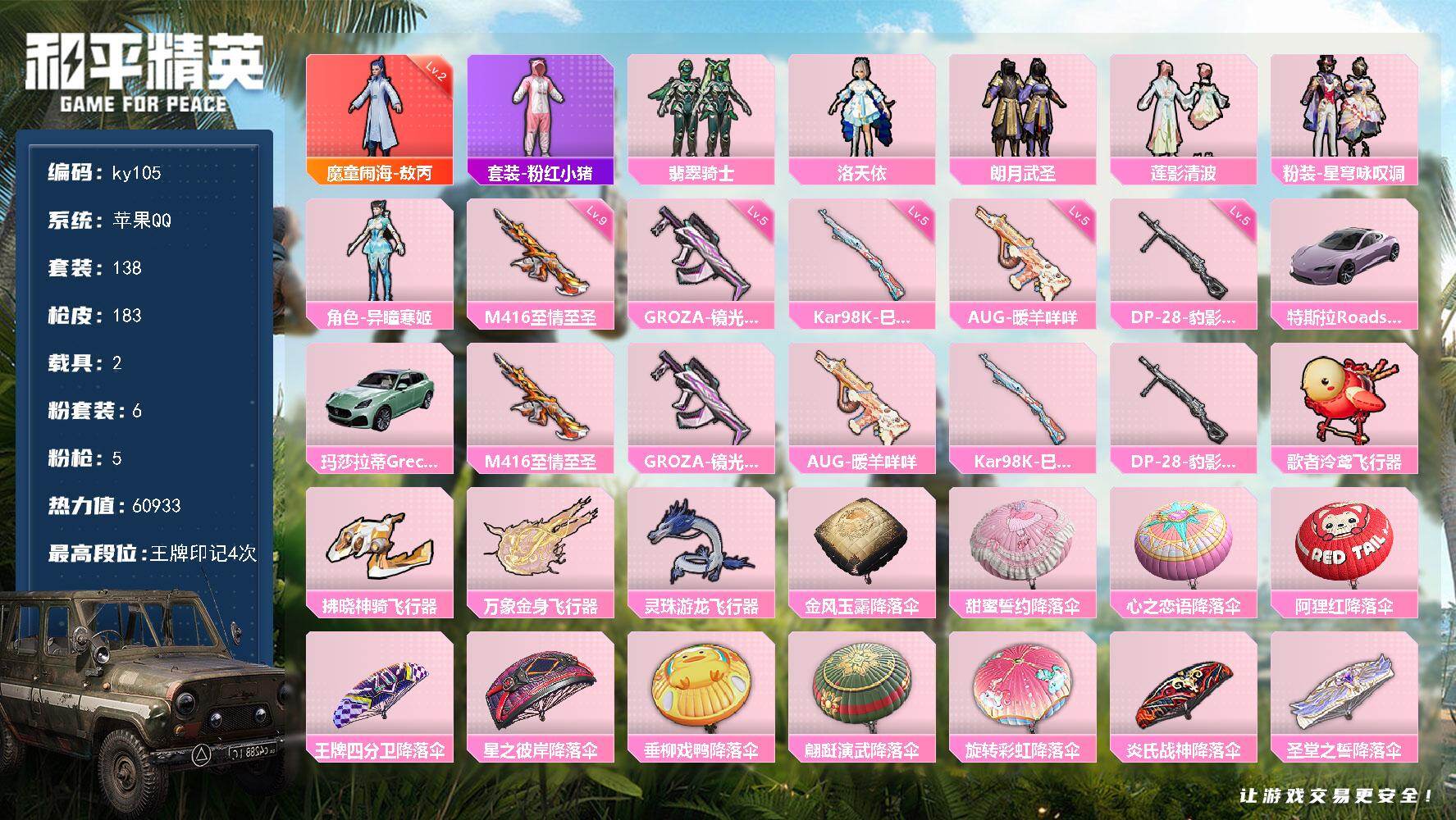 [16975691]苹果 手Q-1神装-6粉装-5特效枪-2载具-4粉色飞行器-60933热力值-4王牌印记-138套装-183枪皮