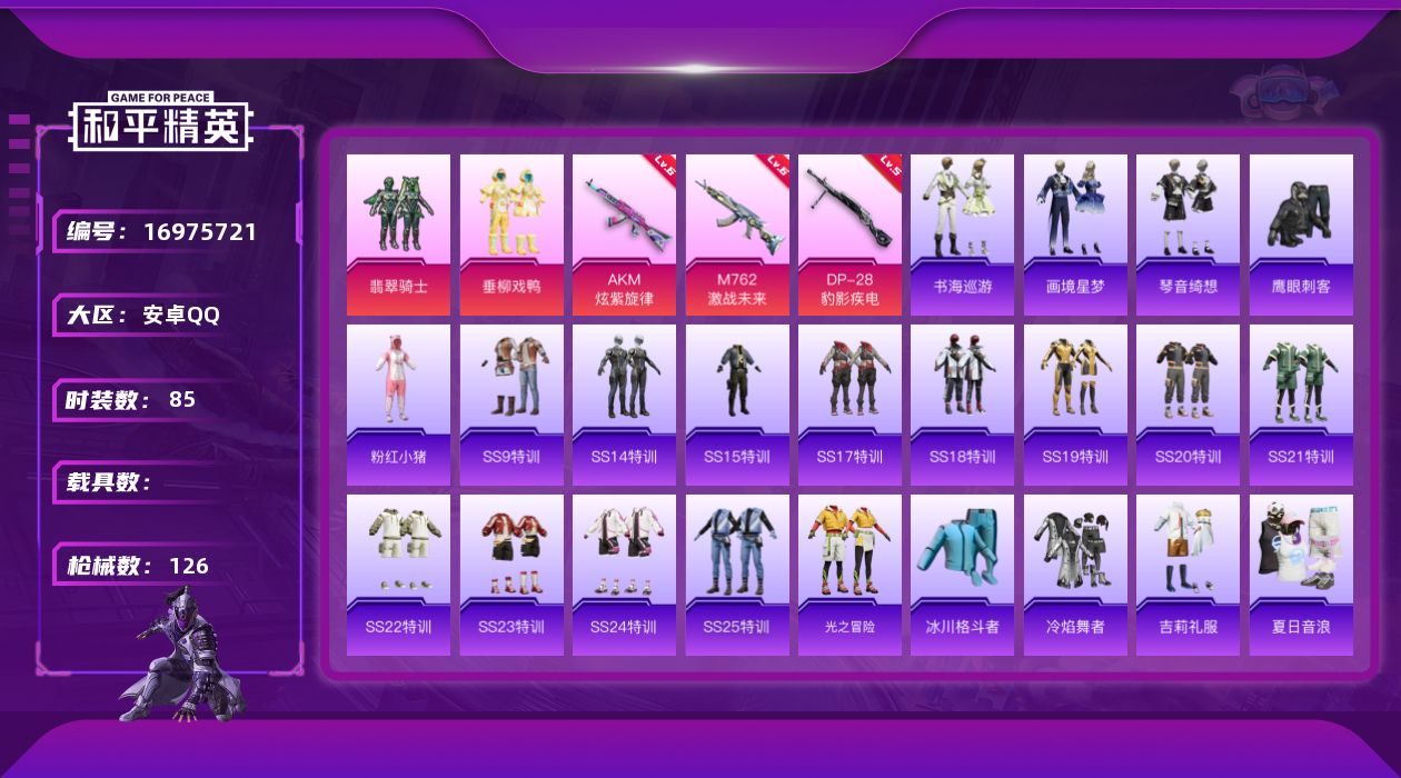 [16975721]安卓 手Q-2粉装-4特效枪-0载具-1粉色飞行器-37666热力值-8王牌印记-85套装-126枪皮 【热门品类】:套装-粉红小猪 【粉色套装】:粉装-翡翠骑士,粉装-垂柳戏鸭 【粉色枪皮等级】:AKM-炫紫旋律(六级),M762-激战未来(六级),AKS-74U-森灵之息(五级),DP-28-豹影疾电(五级) 【粉色枪皮】:AKM-炫紫旋律,M762-激战未来,AKS-74U-森灵之息,DP-28-豹影疾电 【粉色飞行器】:激战未来飞行器 【粉色降落伞】:炫紫旋律降落伞,星之彼岸降落伞,垂柳戏鸭降落伞,暗夜鎏金降落伞,炫光之旅降落伞 【稀有套装】:套装-书海巡游,套装-画境星梦,套装-琴音绮想 【稀有枪皮】:AKM-夜灯,AKM-奇异狩猎者,AKM-星之彼岸,AKM-龙的传人,M16A4-夜灯,M16A4-幻世战舞者,M16A4-甜心亚梦,SCAR-L-炫彩节奏,SCAR-L-玉兔迎春,SCAR-L-红色方程式,M416-夜灯,M416-梨园星光,M416-神秘黑猫,M416-糯团青竹,M416-绯红前夜,M416-蓝色火焰,GROZA-彩虹符号,GROZA-影袭,GROZA-治愈之星,GROZA-田园牧歌,AUG-青春冒险家,QBZ-赛罗,M762-天降萌叽,M762-绯红前夜,Mk47-妙红点点,Mk47-青春冒险家,G36C-炙焰牛王,AC-VAL-天降萌叽,AC-VAL-彩虹甜喵,AC-VAL-甜心亚梦,蜜獾-娇憨猪猪,ACE32-画境星梦,UZI-众神之王,UZI-娇憨猪猪,UZI-金风玉露,UMP45-夜灯,UMP45-蓝色火焰,Vector-彩虹符号,Vector-治愈之星,Vector-田园牧歌,Vector-香水柠檬,汤姆逊-天降萌叽,汤姆逊-耀粉歌者,野牛-王牌四分卫,野牛-青春冒险家,MP5K-众神之王,MP5K-梨园星光,MP5K-画境星梦,P90-筑梦精灵,Kar98K-彩虹符号,Kar98K-炫彩节奏,M24-影袭,M24-治愈之星,M24-炫彩节奏,M24-众神之王,AWM-垂柳戏鸭,AWM-王牌四分卫,SKS-炫彩节奏,SKS-糯团青竹,VSS-星之彼岸,VSS-田园牧歌,Mini14-穿刺龙虾,Mini14-金鼠迎春,Mk14-治愈之星,SLR-众神之王,SLR-娇憨猪猪,SLR-彩虹符号,QBU-青春冒险家,AMR-妙红点点